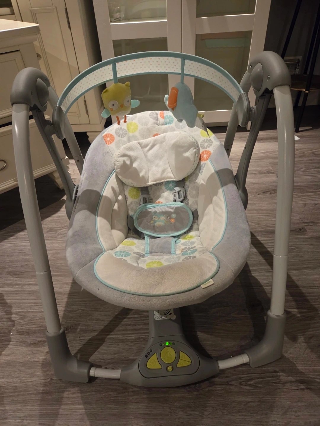 This Ingenuity baby swing features a soft, grey and white owl print fabric. It has multiple speeds and gentle rocking motions. The toy bar includes two plush characters.