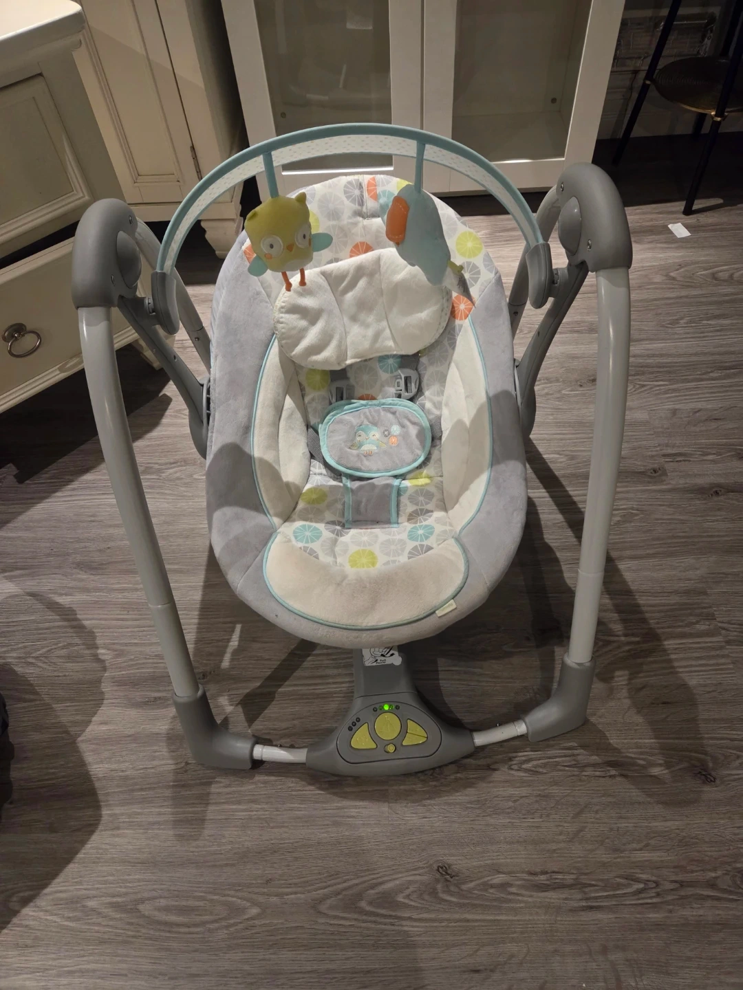 This Ingenuity baby swing features a soft, grey and white owl print fabric. It has multiple speeds and gentle rocking motions. The toy bar includes two plush characters.