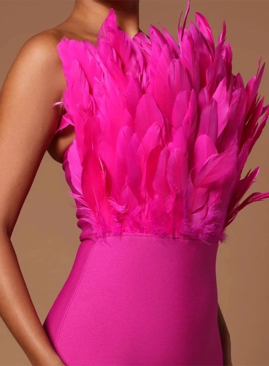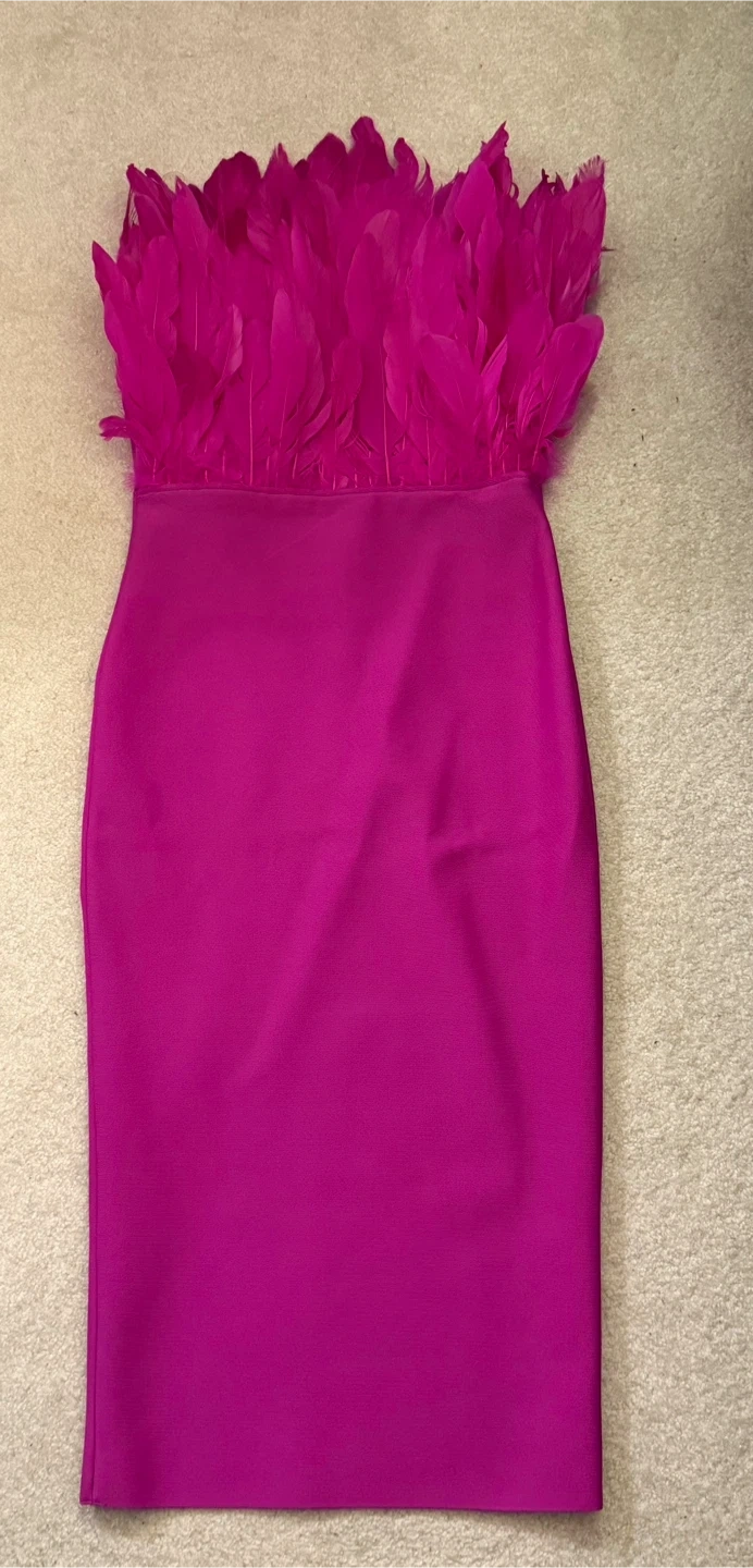 This strapless bodycon dress features a vibrant hot pink hue and a playful feather bodice. It's a fitted style with a zip closure at the back. Perfect for making a statement at any special occasion!