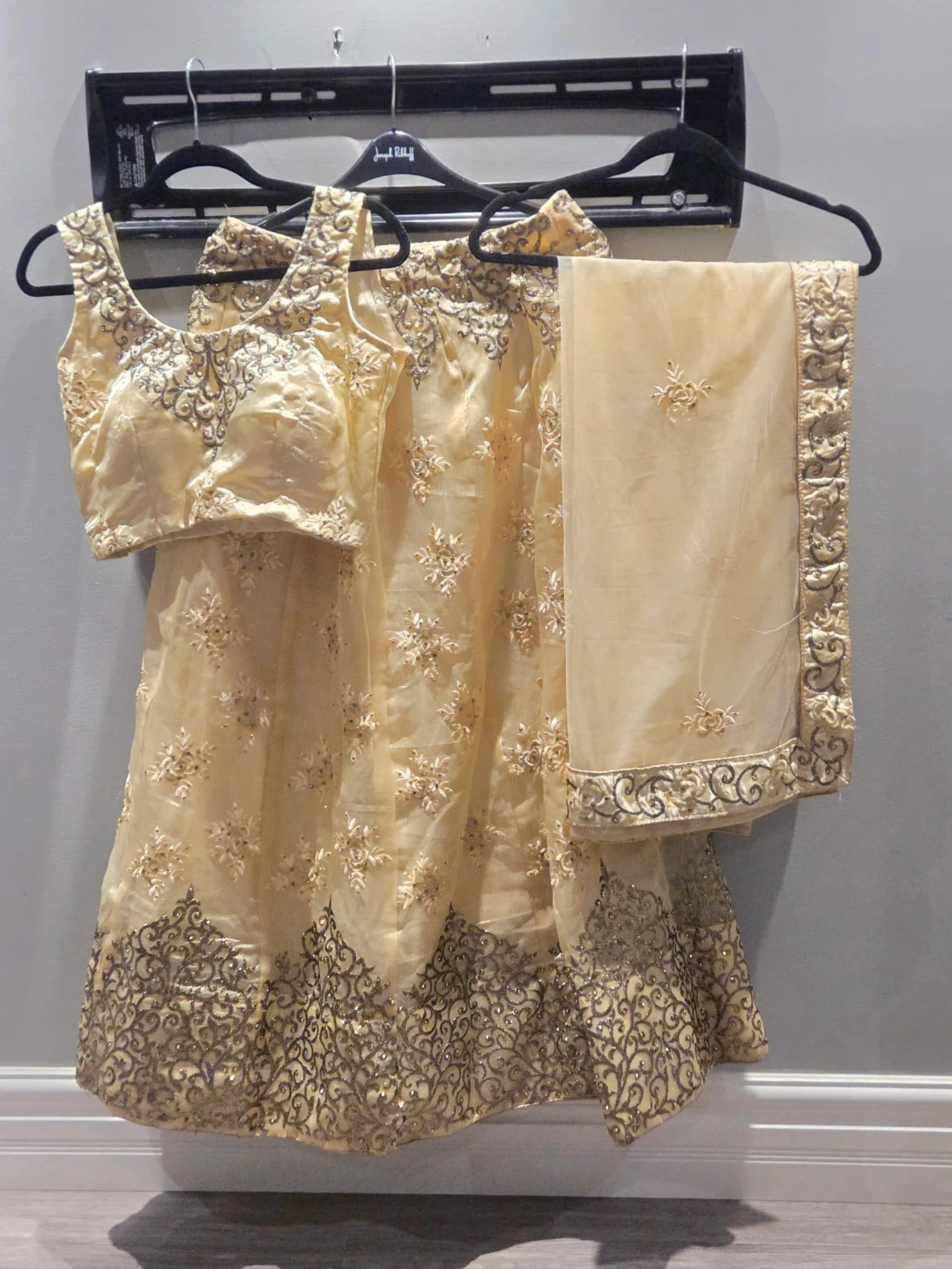 This traditional Indian outfit includes a sleeveless blouse, a flared skirt, and a sheer dupatta. It's adorned with intricate embroidery and sparkling embellishments. This ensemble is perfect for festive occasions and cultural celebrations.