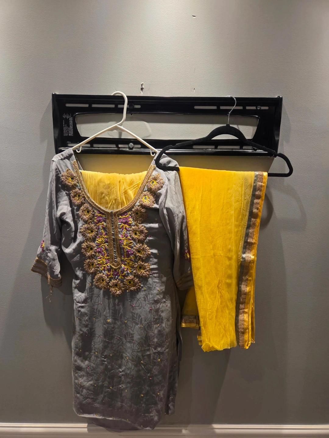 This is a three-piece Indian outfit. It features a grey kurti with intricate embroidery around the neckline and sleeves, paired with a vibrant yellow dupatta and matching salwar. The fabric appears to be a soft blend, suitable for casual or semi-formal wear.