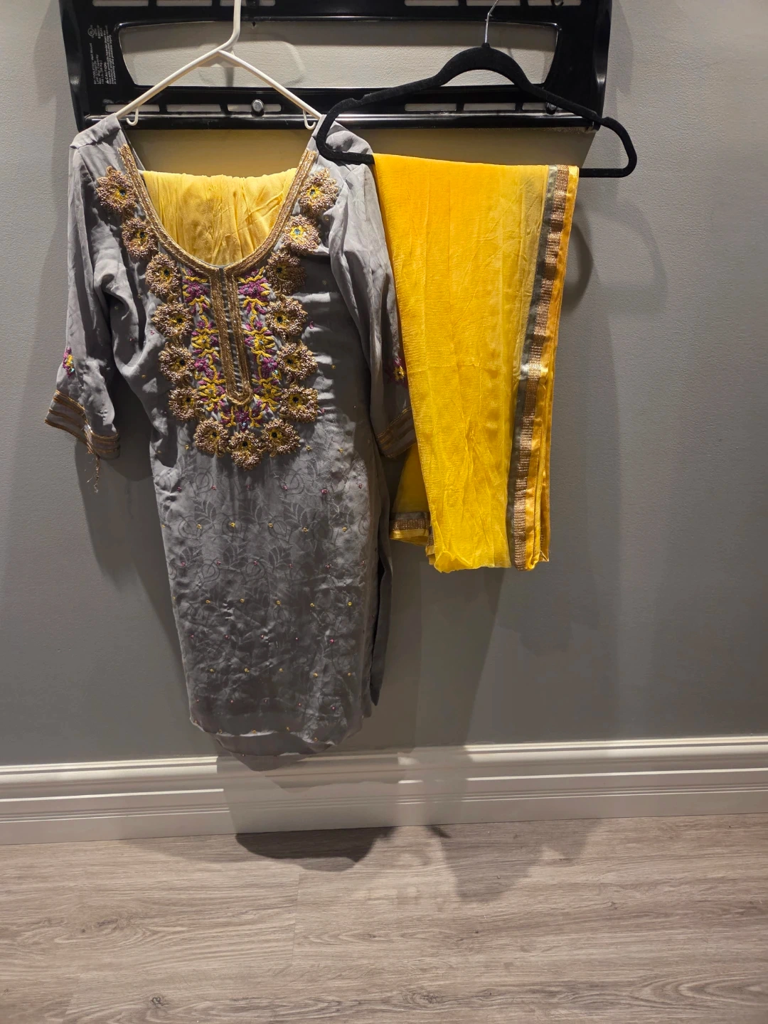 This is a three-piece Indian outfit. It features a grey kurti with intricate embroidery around the neckline and sleeves, paired with a vibrant yellow dupatta and matching salwar. The fabric appears to be a soft blend, suitable for casual or semi-formal wear.