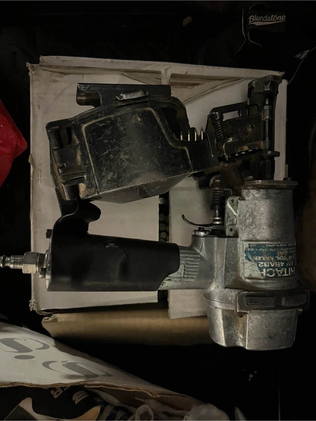 Hitachi coil roofing nailer, model NV45AB2. Includes a box of coil roofing nails. Air powered tool for construction or roofing projects.