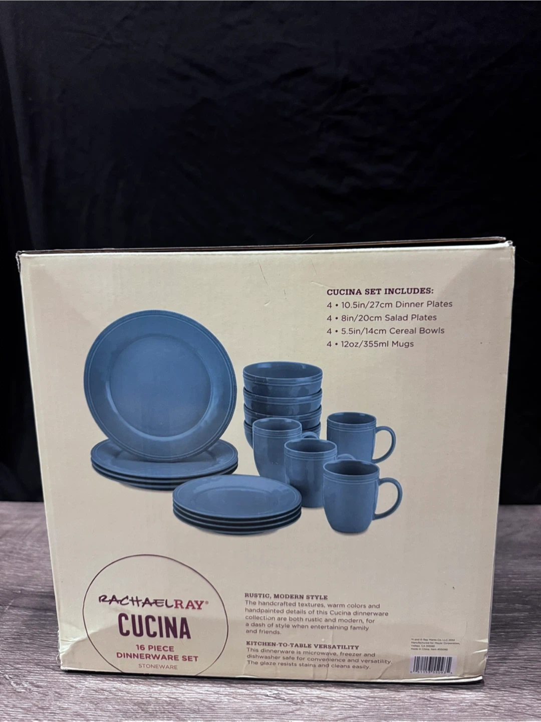 This Rachael Ray Cucina 16-piece dinnerware set includes 4 dinner plates, 4 salad plates, 4 cereal bowls, and 4 mugs. It's made of durable stoneware and features a rustic, modern style. The dinnerware is microwave, freezer, and dishwasher safe for easy cleanup. Brand new never used, in the box. Willing to negotiate or barter for a kitchen trash bin.