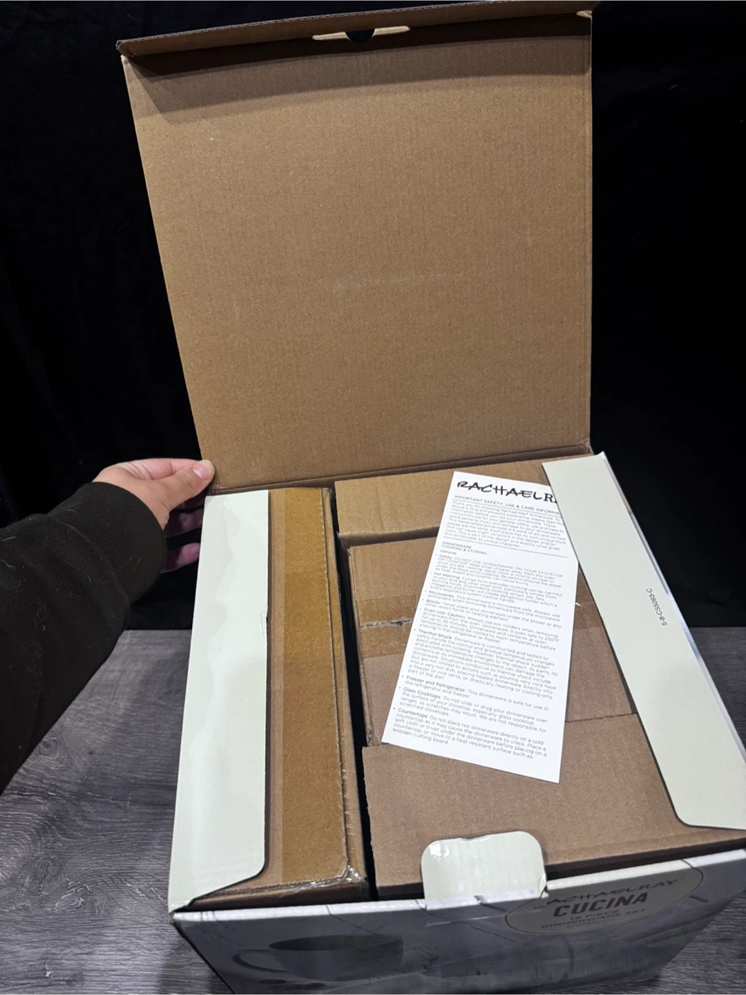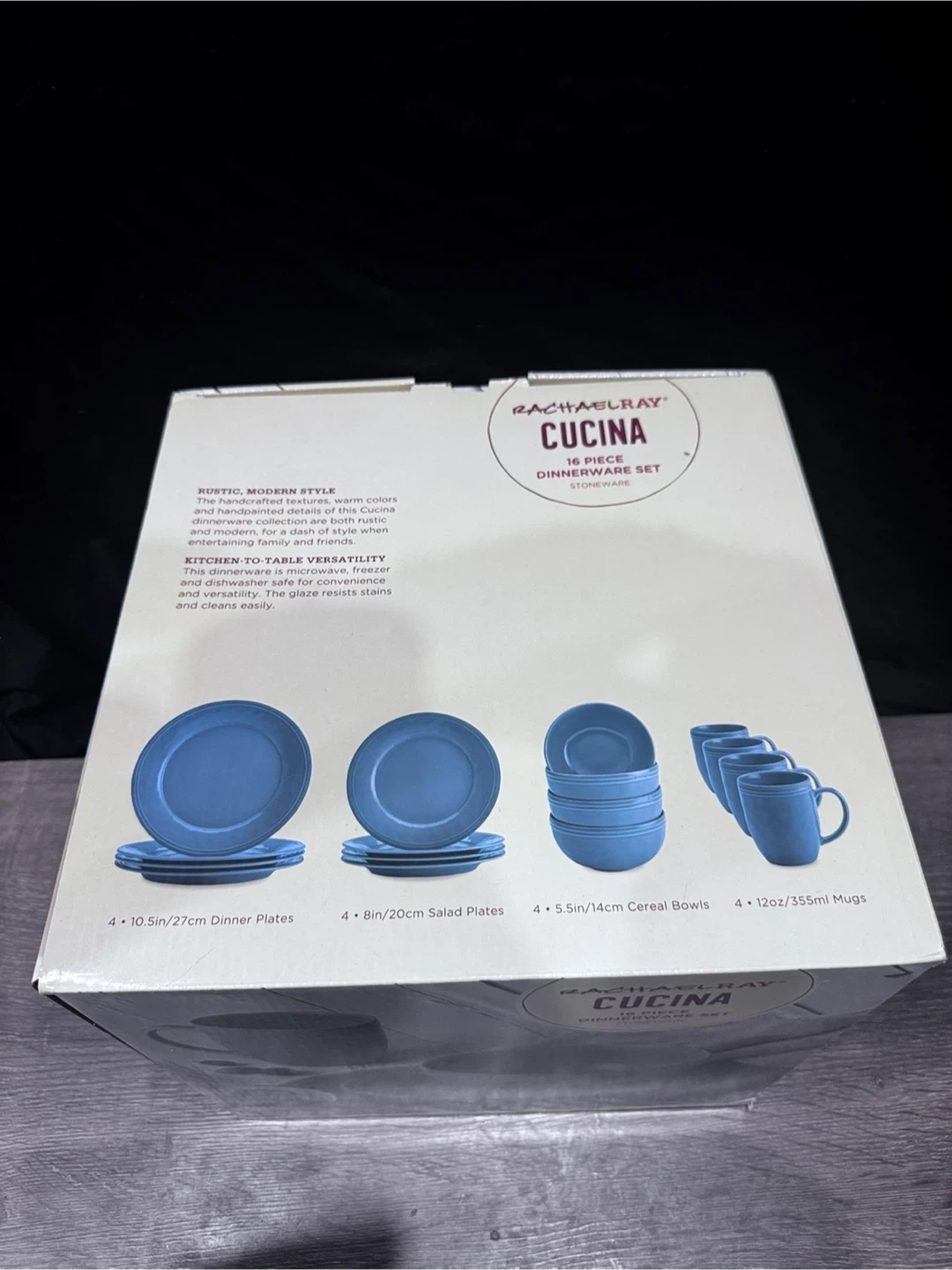 This Rachael Ray Cucina 16-piece dinnerware set includes 4 dinner plates, 4 salad plates, 4 cereal bowls, and 4 mugs. It's made of durable stoneware and features a rustic, modern style. The dinnerware is microwave, freezer, and dishwasher safe for easy cleanup. Brand new never used, in the box. Willing to negotiate or barter for a kitchen trash bin.