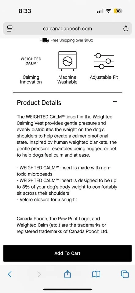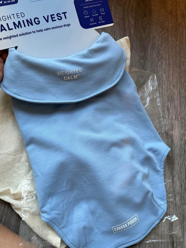 Blue Canada Pooch Weighted Calming Vest, size L. For dogs 26-45 lbs. Has a WEIGHTED CALM insert with non-toxic microbeads. Provides gentle pressure to help calm anxious dogs. Machine washable. Adjustable fit with velcro closure for a snug fit.