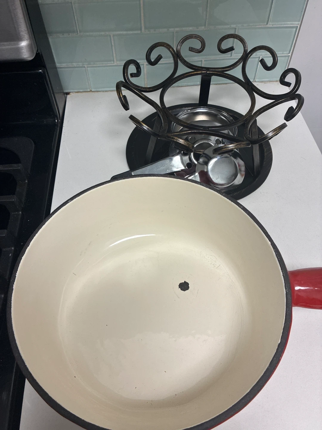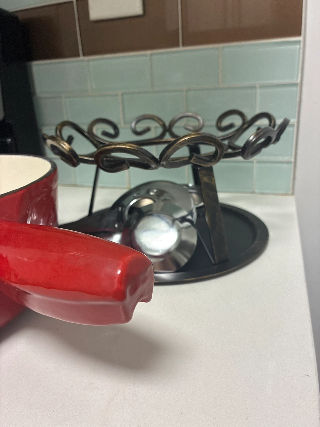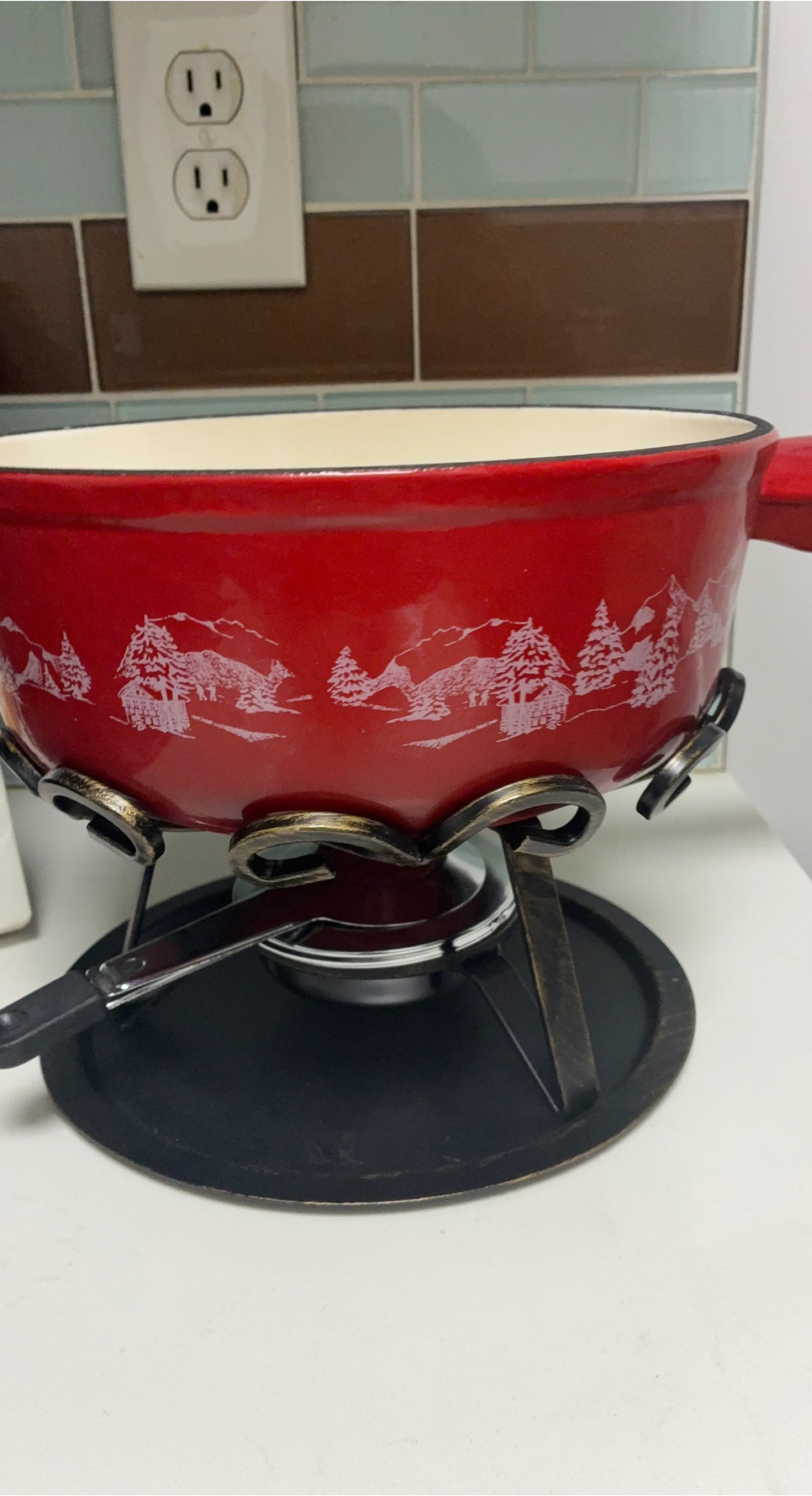 This is a red cast iron Kuhn Rikon Alpine Meadow cheese fondue pot with an accompanying rechaud stand and burn. It is a red enameled fondue pot with a festive winter scene design. Includes a black metal stand with ornate scrollwork and a fuel holder. Comes with two 80g Swiss Fire Gel fuel. Small chip inside pot and no fondue sticks included.