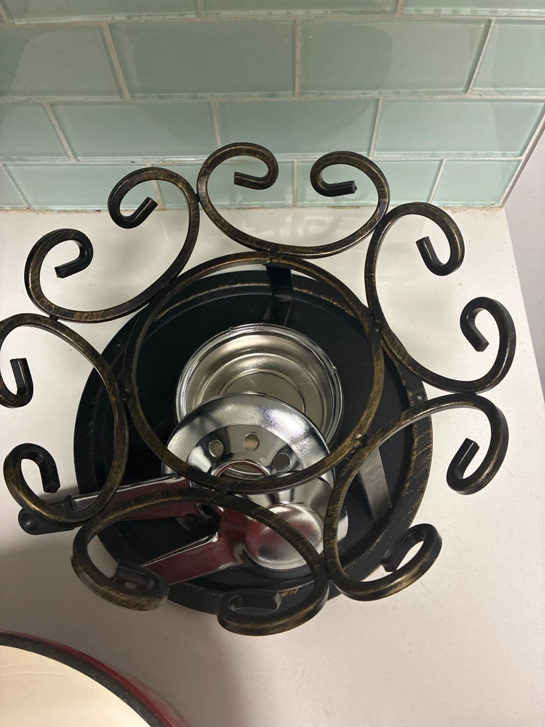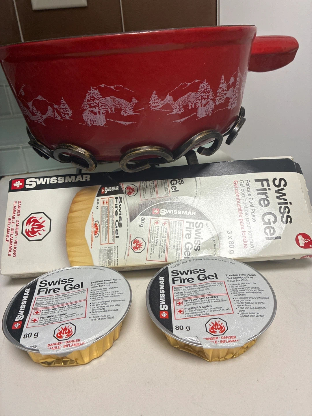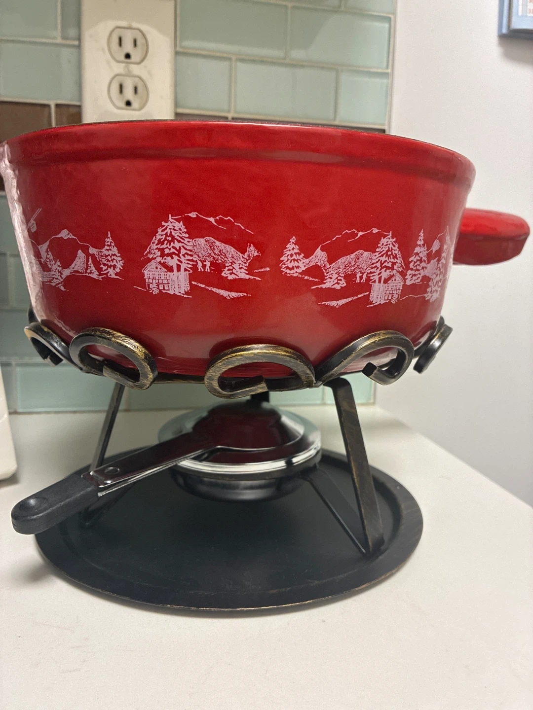 This is a red cast iron Kuhn Rikon Alpine Meadow cheese fondue pot with an accompanying rechaud stand and burn. It is a red enameled fondue pot with a festive winter scene design. Includes a black metal stand with ornate scrollwork and a fuel holder. Comes with two 80g Swiss Fire Gel fuel. Small chip inside pot and no fondue sticks included.