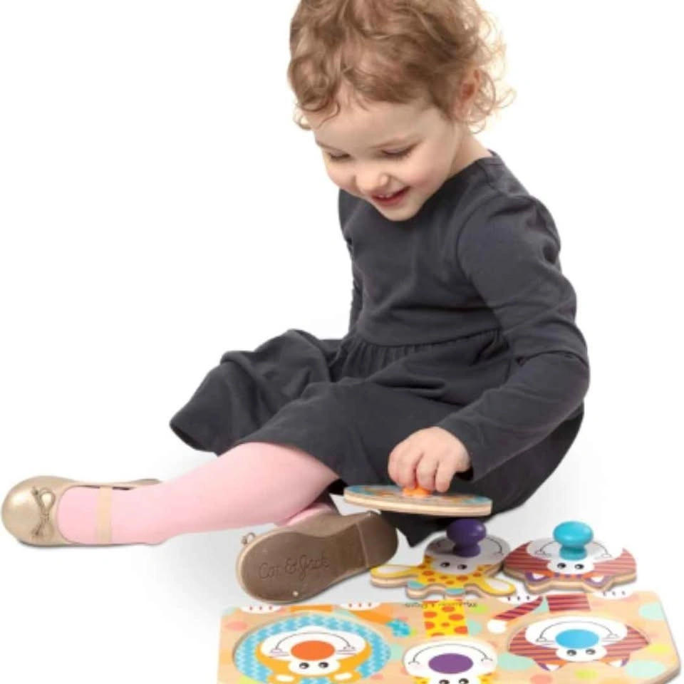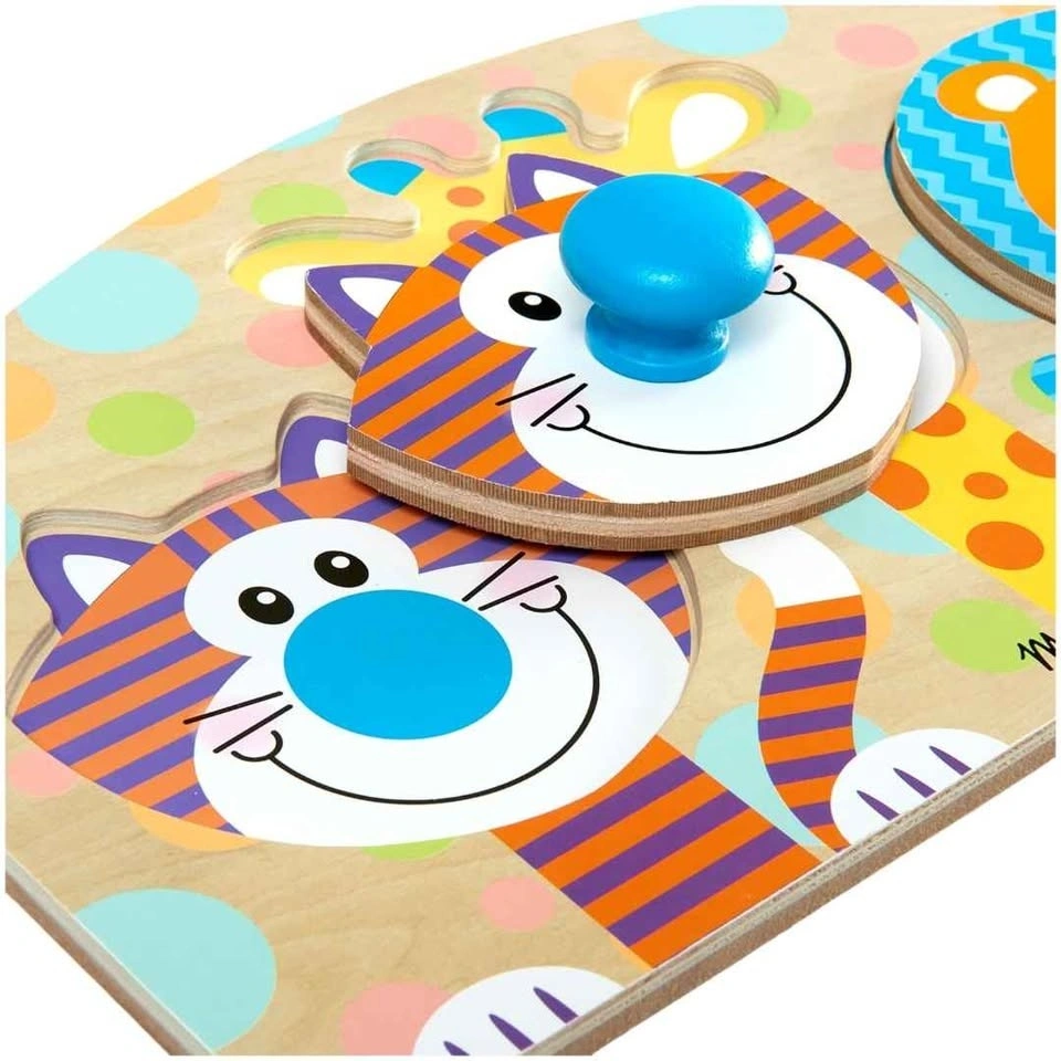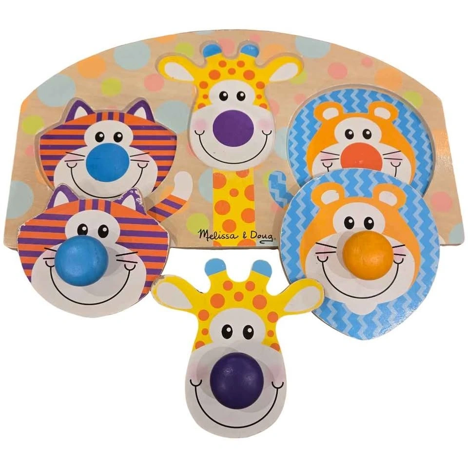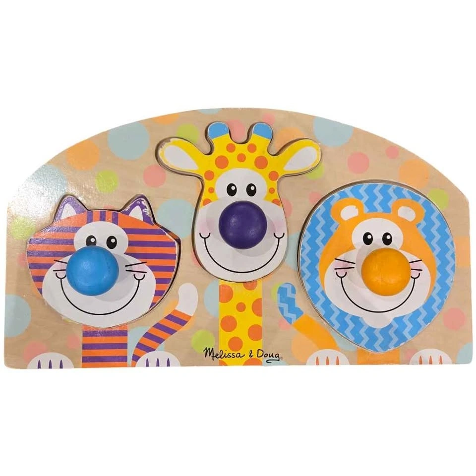 - Pieces include giraffe, tiger, and lion with easy-grasp wooden knob noses