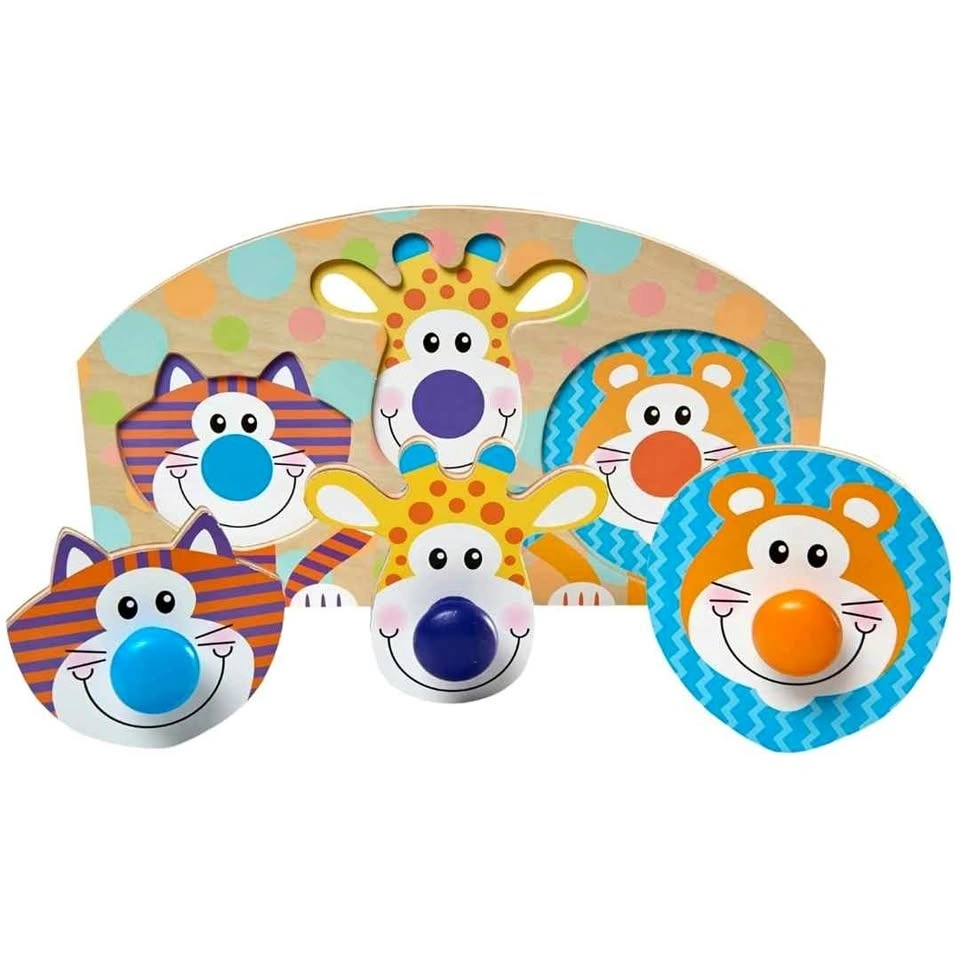 - Pieces include giraffe, tiger, and lion with easy-grasp wooden knob noses