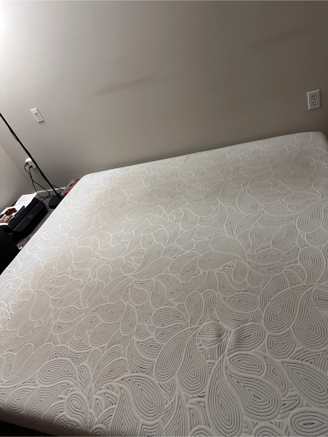 This is a white king size mattress with a unique swirling pattern on the fabric. It's a comfortable mattress ready for a new home. Mattress dimensions are standard queen size.
