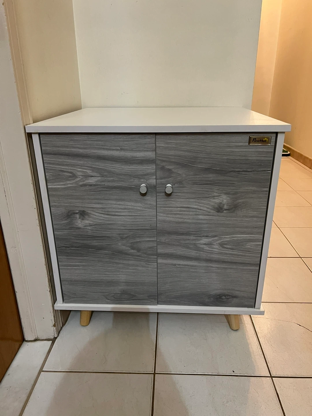 This versatile nightstand features a wood grain finish and two doors. It has an opening on the side for pet access. Perfect for discreetly housing a litter box or pet bed!