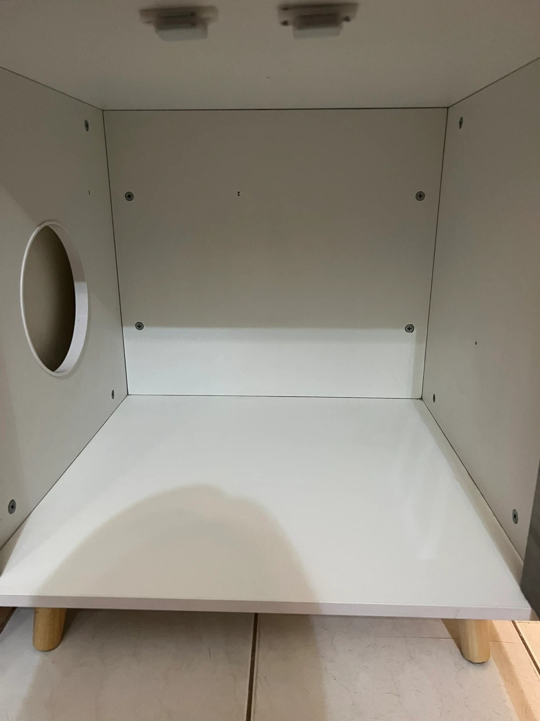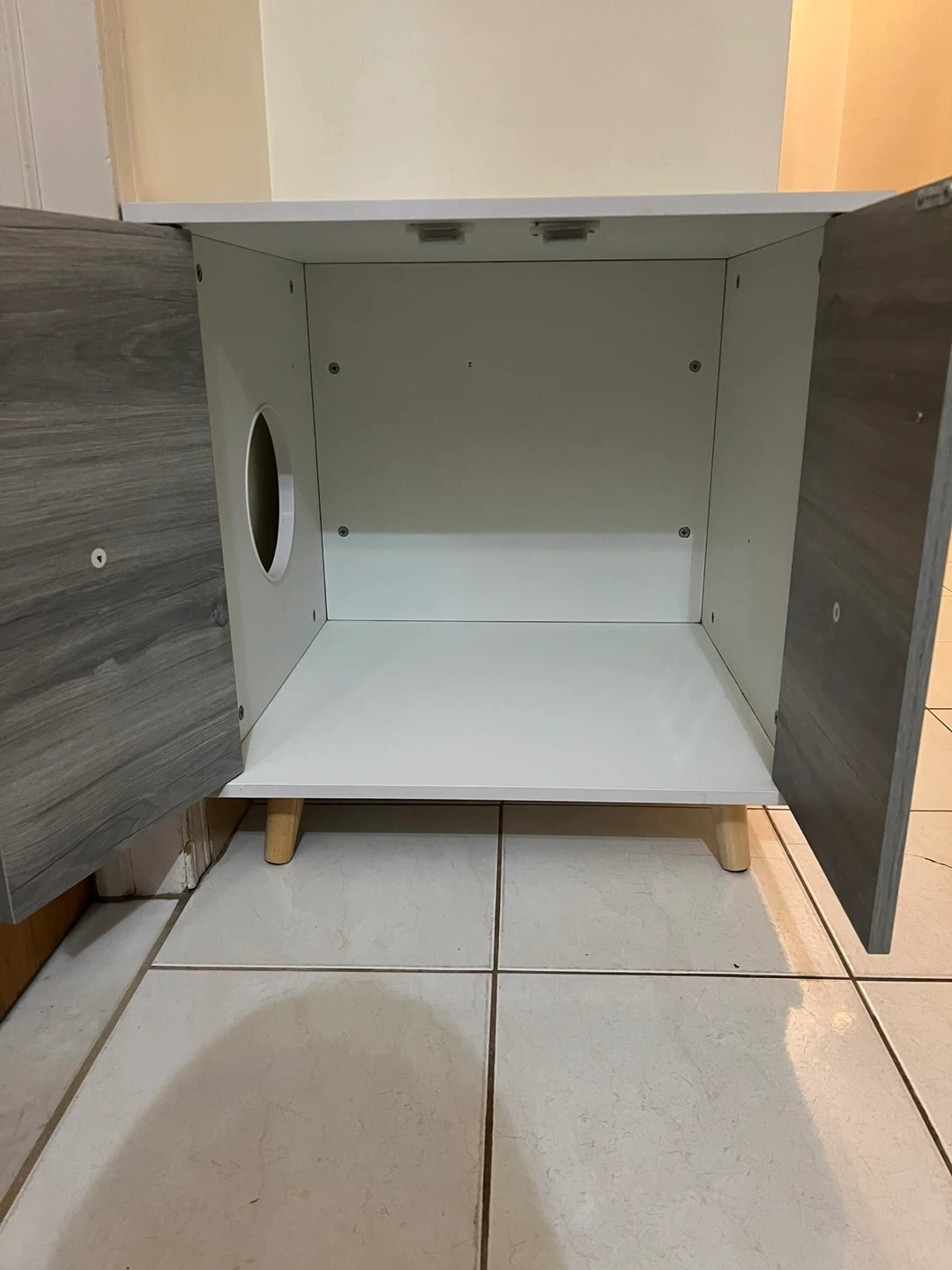 This versatile nightstand features a wood grain finish and two doors. It has an opening on the side for pet access. Perfect for discreetly housing a litter box or pet bed!