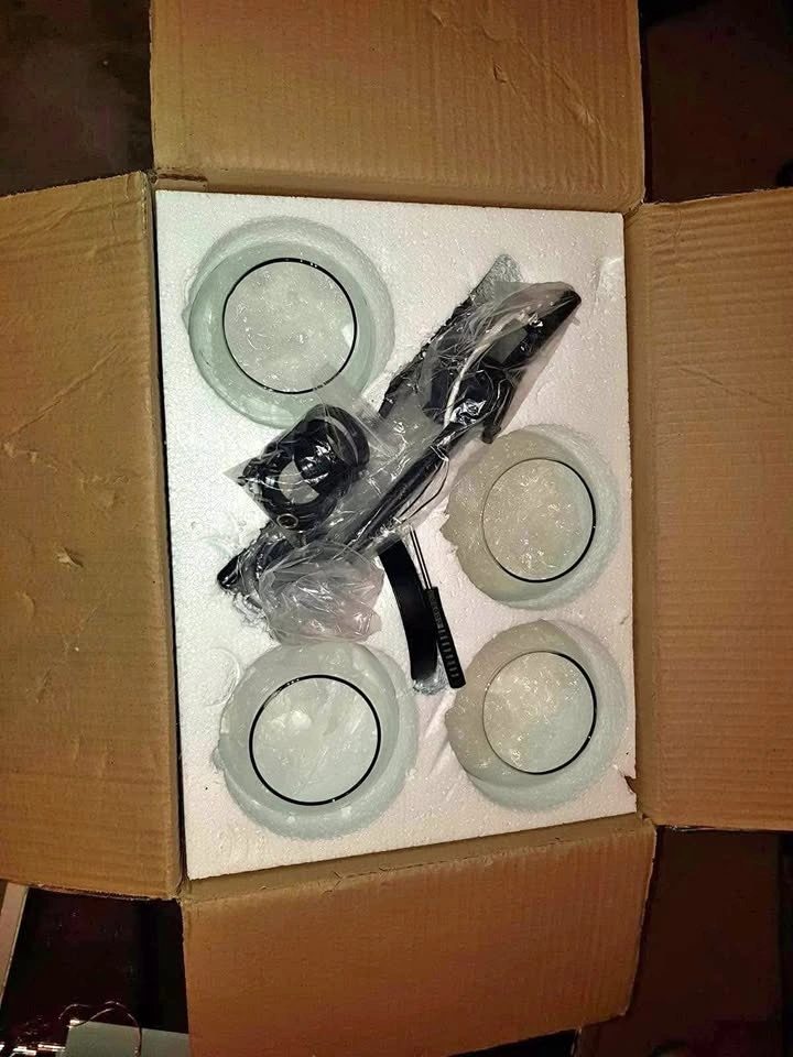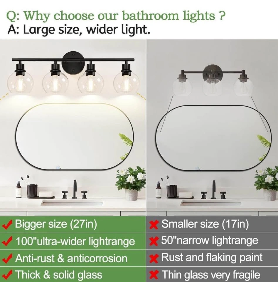 BRAND-NEW 4-light bathroom light fixture, black finish with clear glass globe shades. Suitable for bathroom, kitchen, living room, hallway, cabinet, bedroom, or porch.