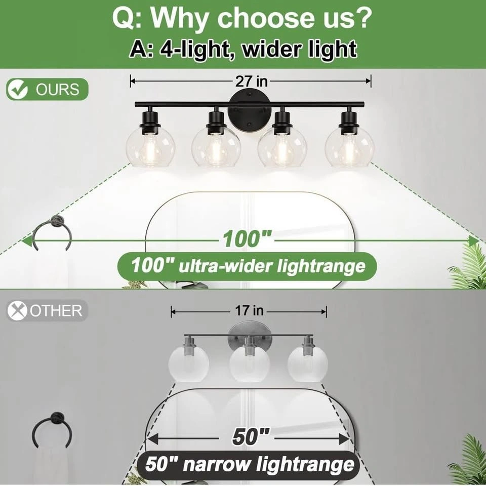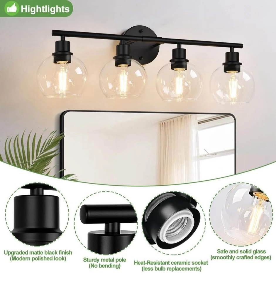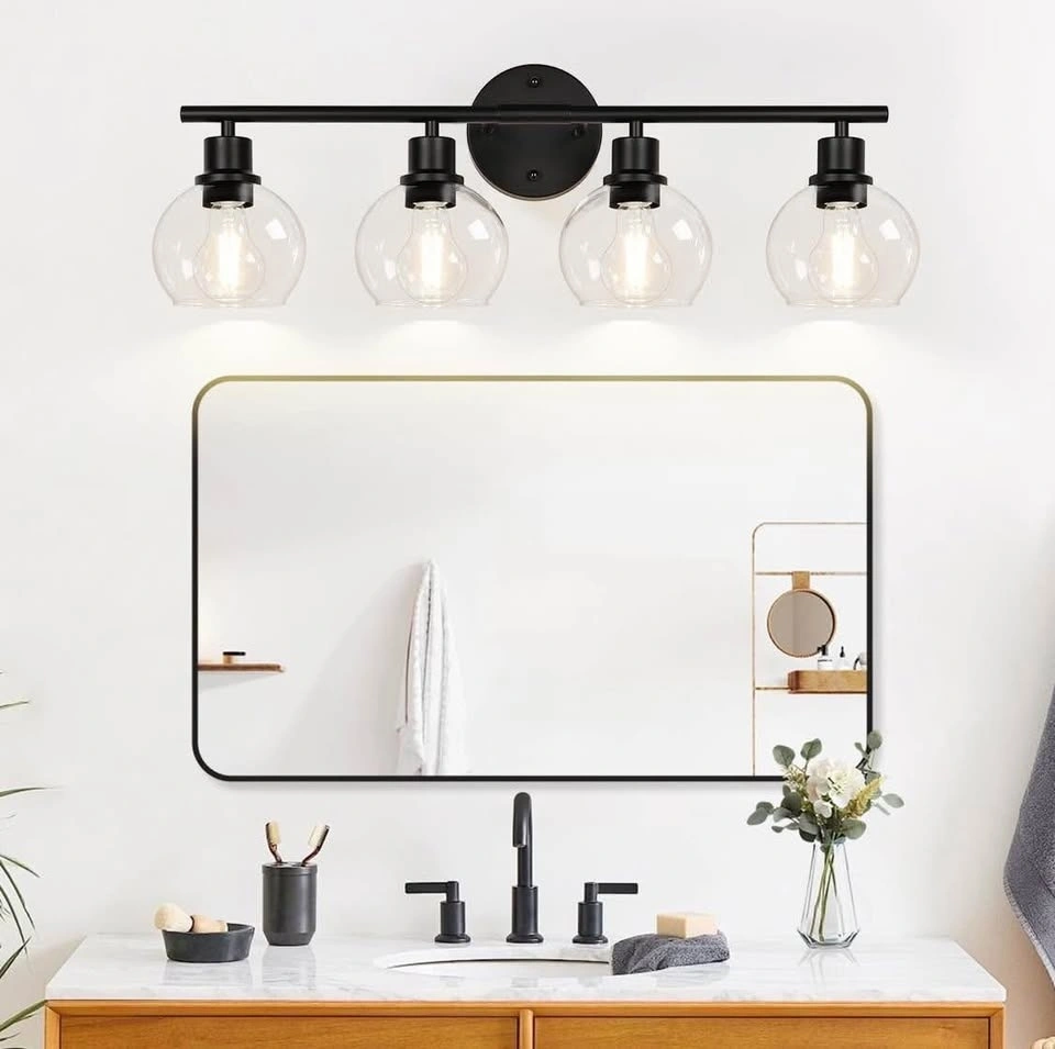 BRAND-NEW 4-light bathroom light fixture, black finish with clear glass globe shades. Suitable for bathroom, kitchen, living room, hallway, cabinet, bedroom, or porch.