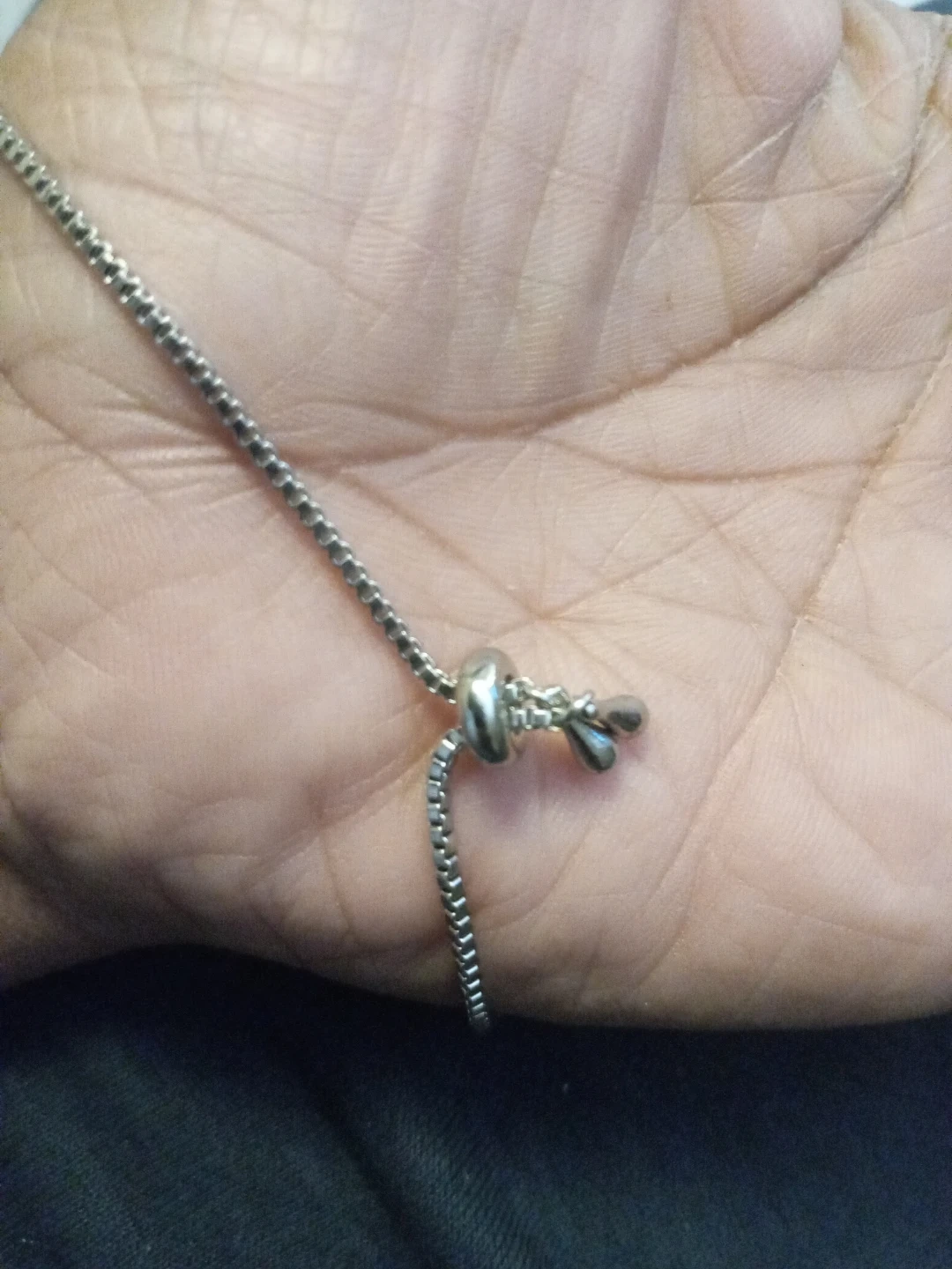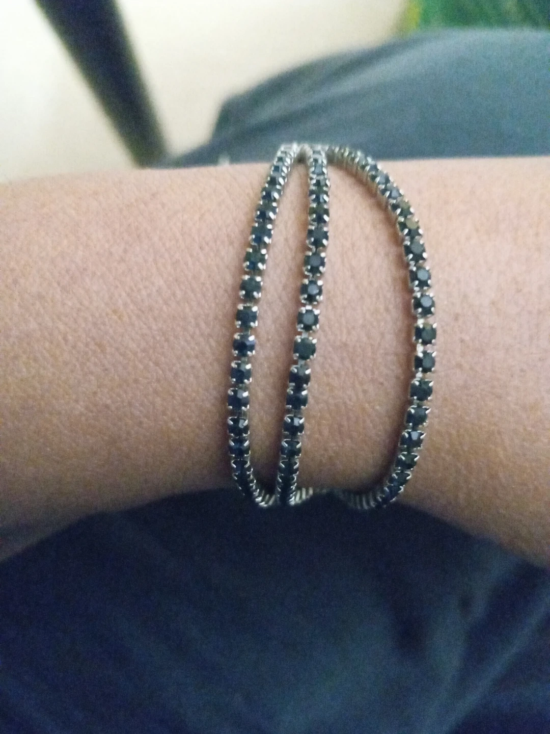 This bracelet features a silver-tone metal band lined with small black stones. It has an adjustable sliding clasp for a comfortable fit. It's a nice accent piece for any outfit!
