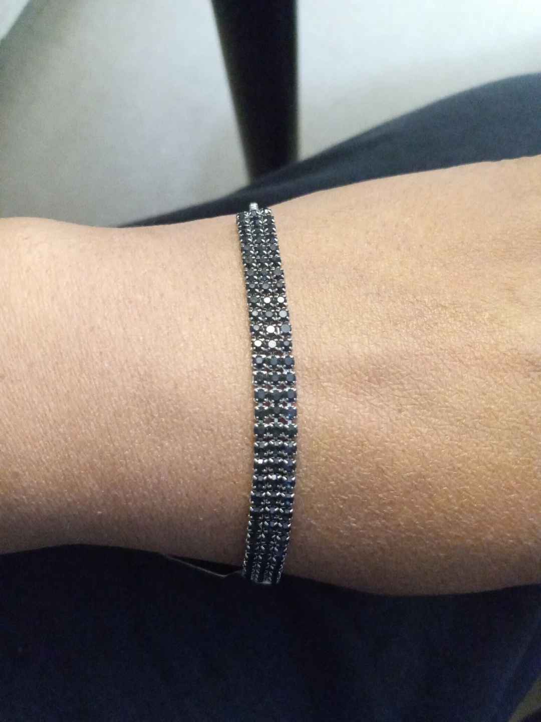 This bracelet features a silver-tone metal band lined with small black stones. It has an adjustable sliding clasp for a comfortable fit. It's a nice accent piece for any outfit!