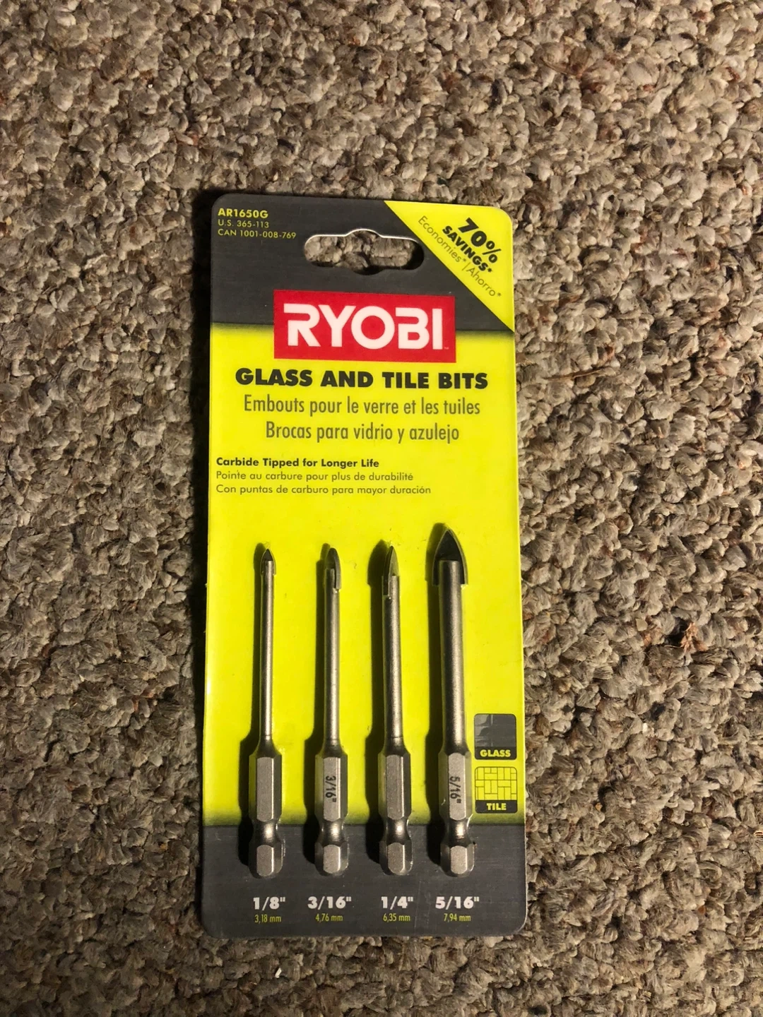 This Ryobi set includes four glass and tile drill bits. It's carbide tipped for longer life. Sizes are 1/8", 3/16", 1/4", and 5/16".