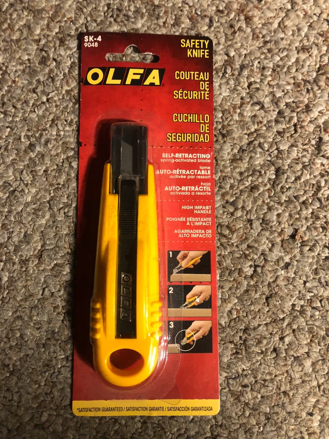 This is a yellow OLFA safety knife with a self-retracting, spring-activated blade. It features a high-impact handle for durability. This utility knife is designed for safety and efficiency in cutting tasks.