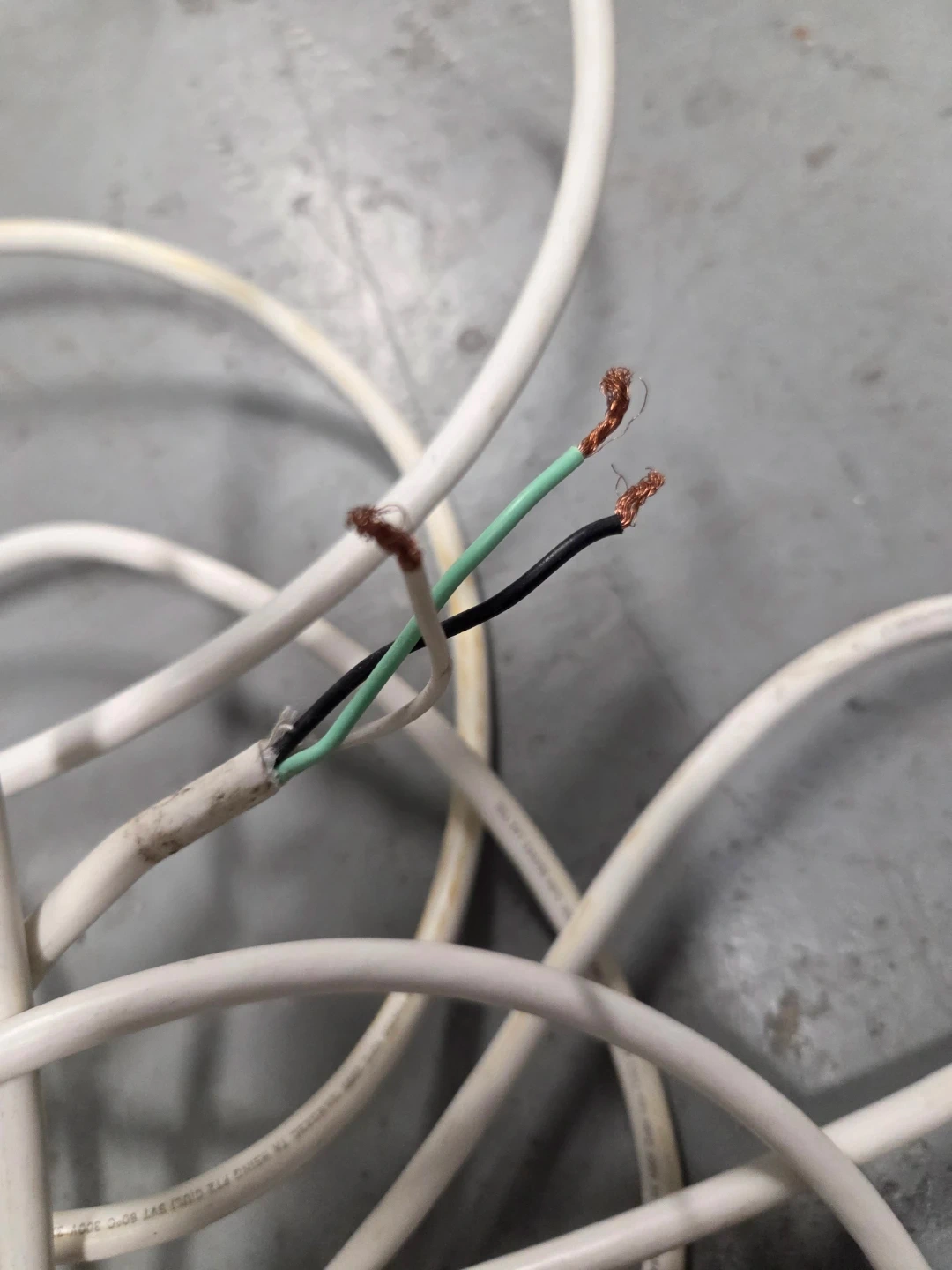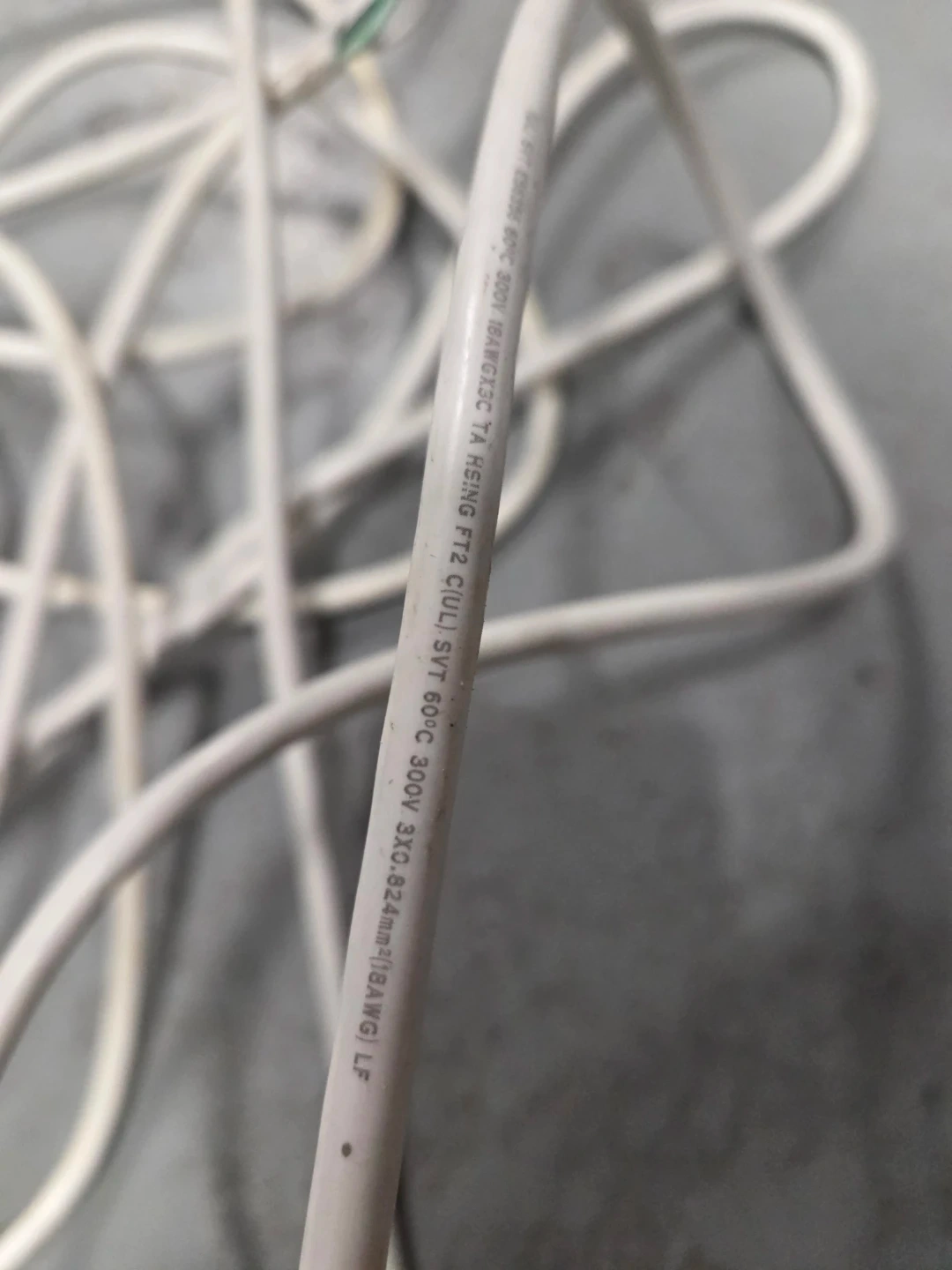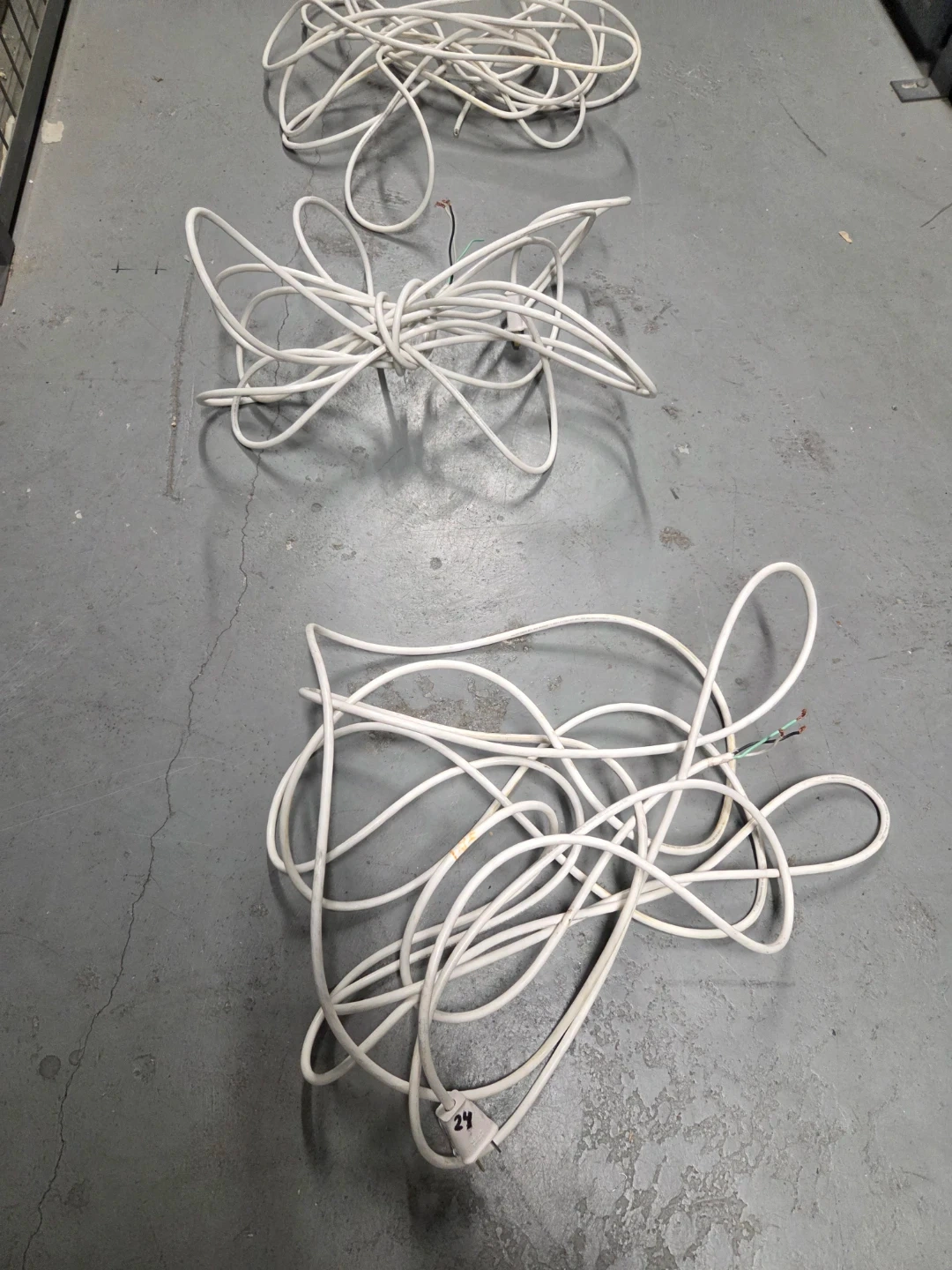 Three white extension cords with a standard plug on one end, bare wires on the other end. The cord is 18AWG and rated for 300V. It's suitable for general use around the house. Lengths: 24', 24', 22'