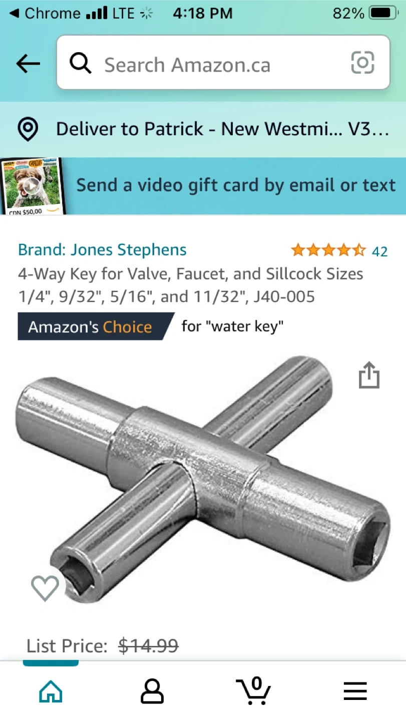 This is a 4-way key from Jones Stephens. It's designed for valve, faucet, and sillcock sizes including 1/4", 9/32", 5/16", and 11/32". It's a handy tool for various plumbing tasks.