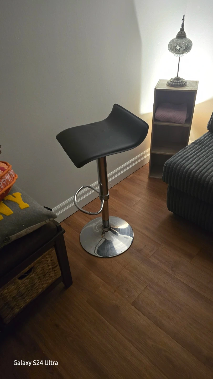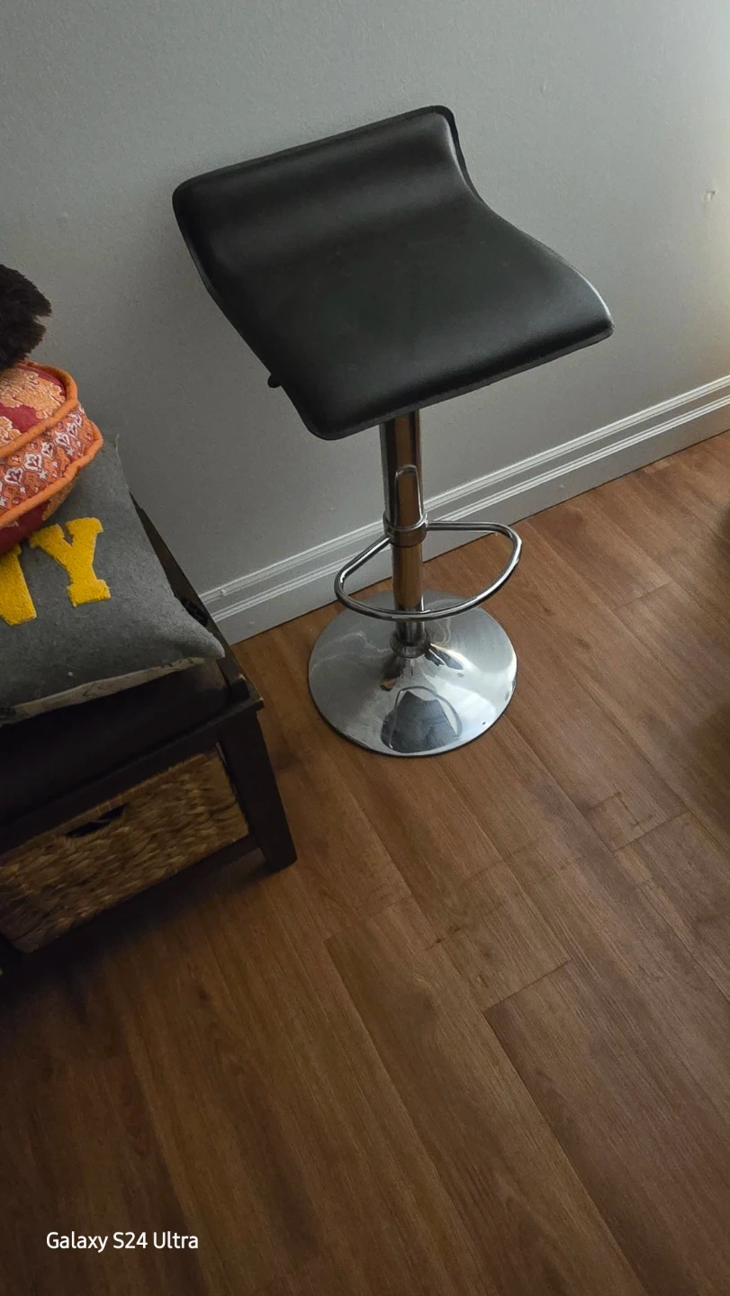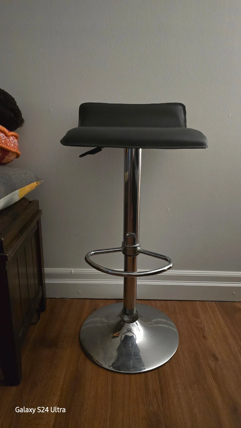 This bar stool features a padded black seat and a chrome base with adjustable height. It's perfect for a kitchen island or home bar. The seat is made of faux leather.