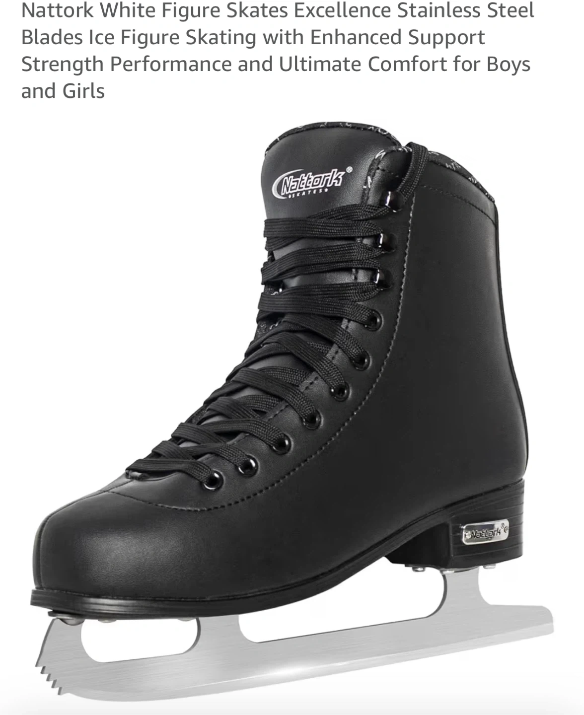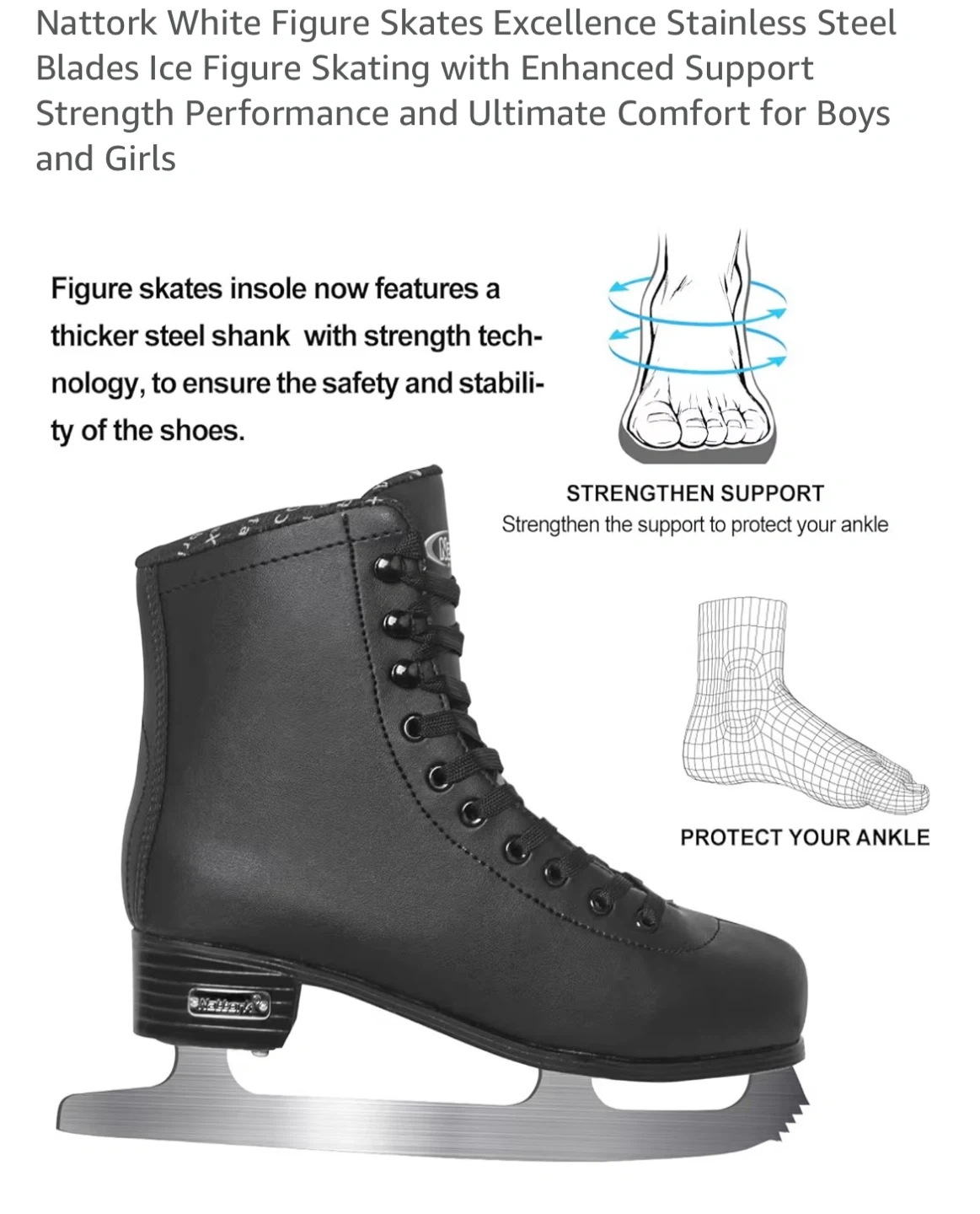 Nattork figure skates feature stainless steel blades and a PU leather exterior.