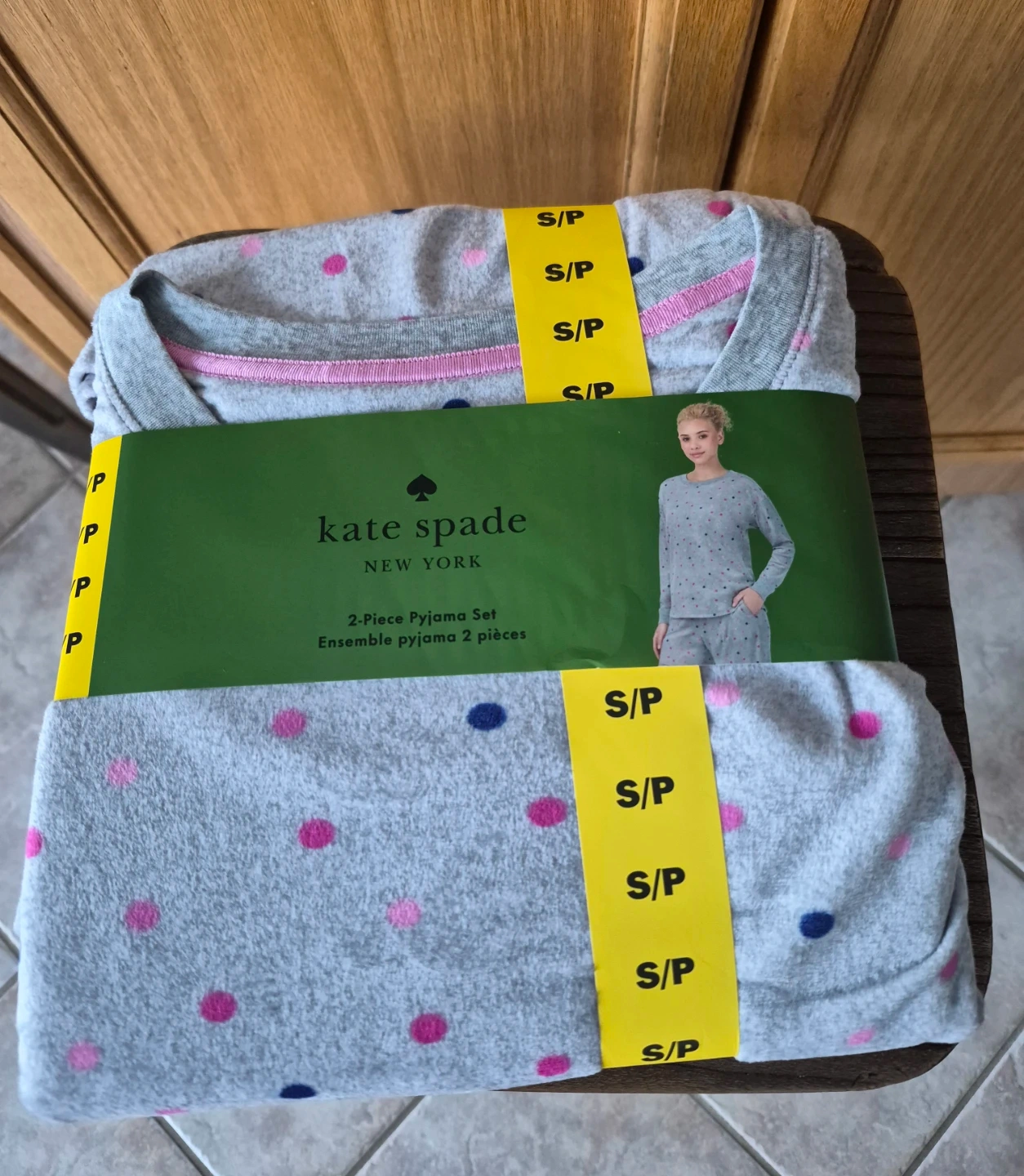 This is a Kate Spade New York 2-piece pyjama set. It's a small/petite size and features a grey background with pink and blue polka dots. Comfortable for lounging at home!
