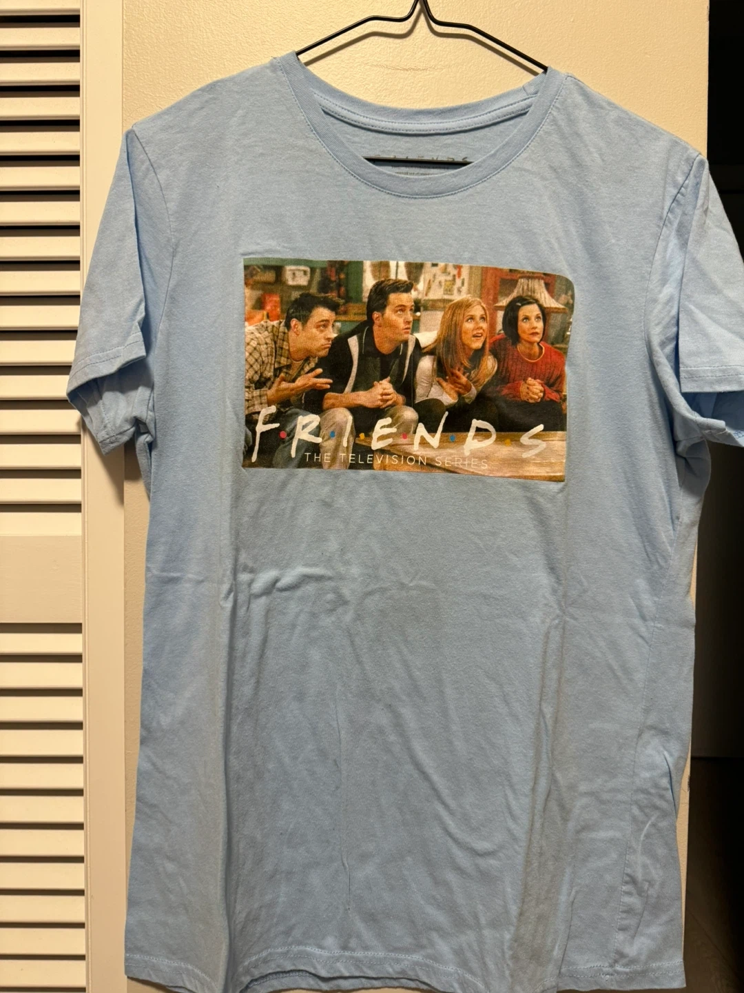 This light blue t-shirt features the main cast of the iconic Friends TV Series. It's made of a soft cotton blend. A great find for any fan!