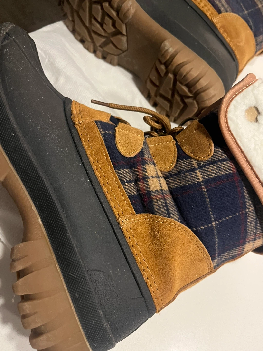 Women's winter boots from STO. Features a plaid fabric shaft and sherpa lining. Rubber sole with lug treads. US size 9.