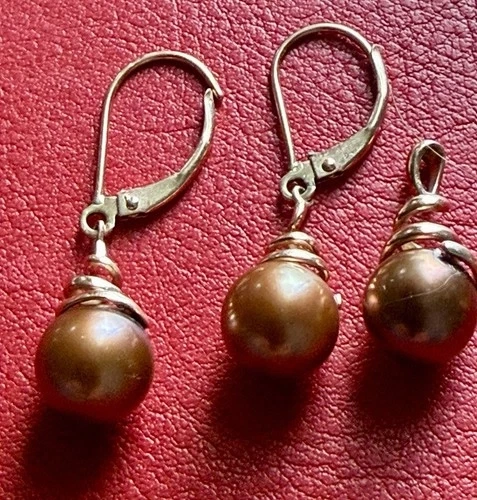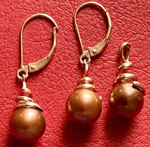 Beautiful matching brown pearl earrings and pendant, crafted in solid 14K rose gold. The earrings feature secure leverback closures, and the pendant is designed to be worn on a chain of your choice. Metal: 14K rose gold (stamped). Earrings: Leverback style. Pendant: Pearl pendant (chain not included). Pearl Type: Cultured pearls. Pearl Color: Brown with natural luster and overtones. Pearl Shape: Round. Condition: Pre-owned, very good condition. Chain is not included. Photos are part of the description. Estate jewelry piece. You will receive the exact items shown.