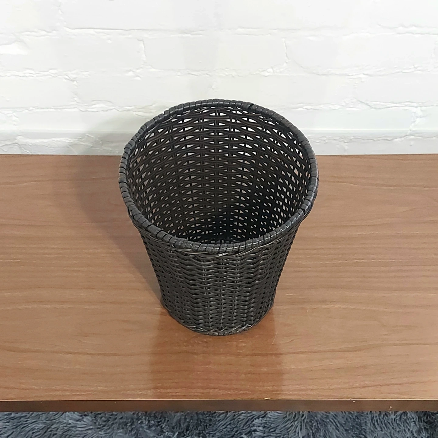 Tall resin wicker pattern basket, with metal inner frame. In excellent like-new pre-owned condition. Measures 10.5 inches tall, 9 inches wide across the top, and 6.75 inches wide across the bottom. From a pet free and smoke free home.