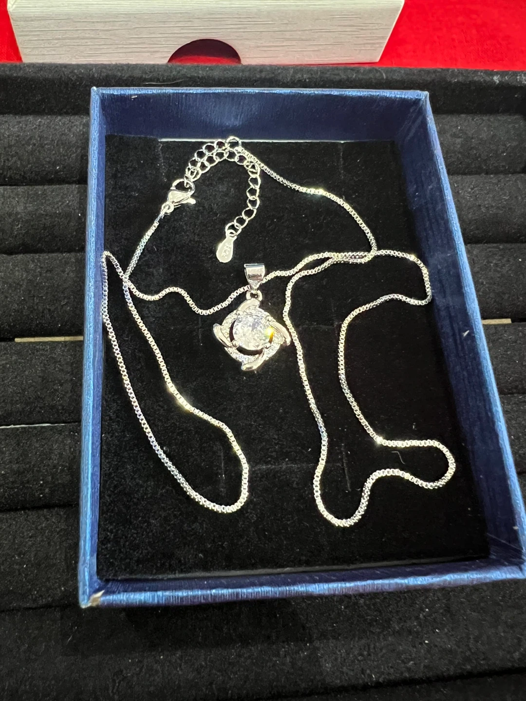 This elegant necklace features a sparkly crystal pendant set in 925 sterling silver. It comes with an 18-inch chain. It's perfect for adding a touch of sparkle to any outfit, day or night!