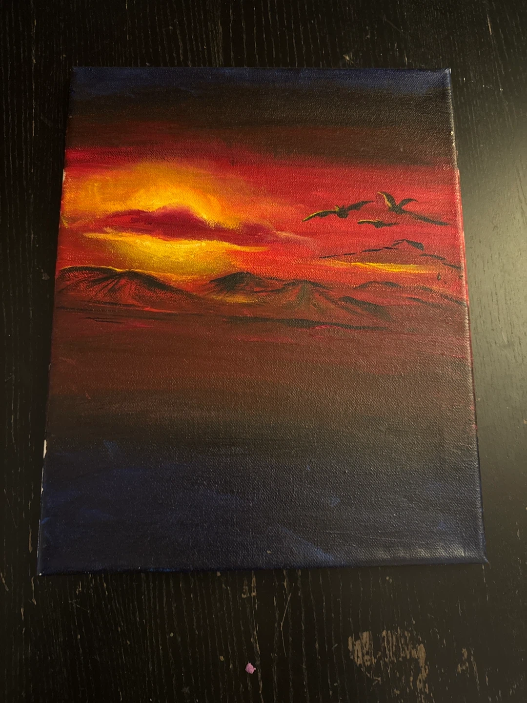 Acrylic painting on canvas depicting a vibrant sunset over a mountainous landscape with birds flying in the sky. The colours transition from deep blues and reds to bright yellows and oranges. It's a lovely piece for home decor. 13 x 11