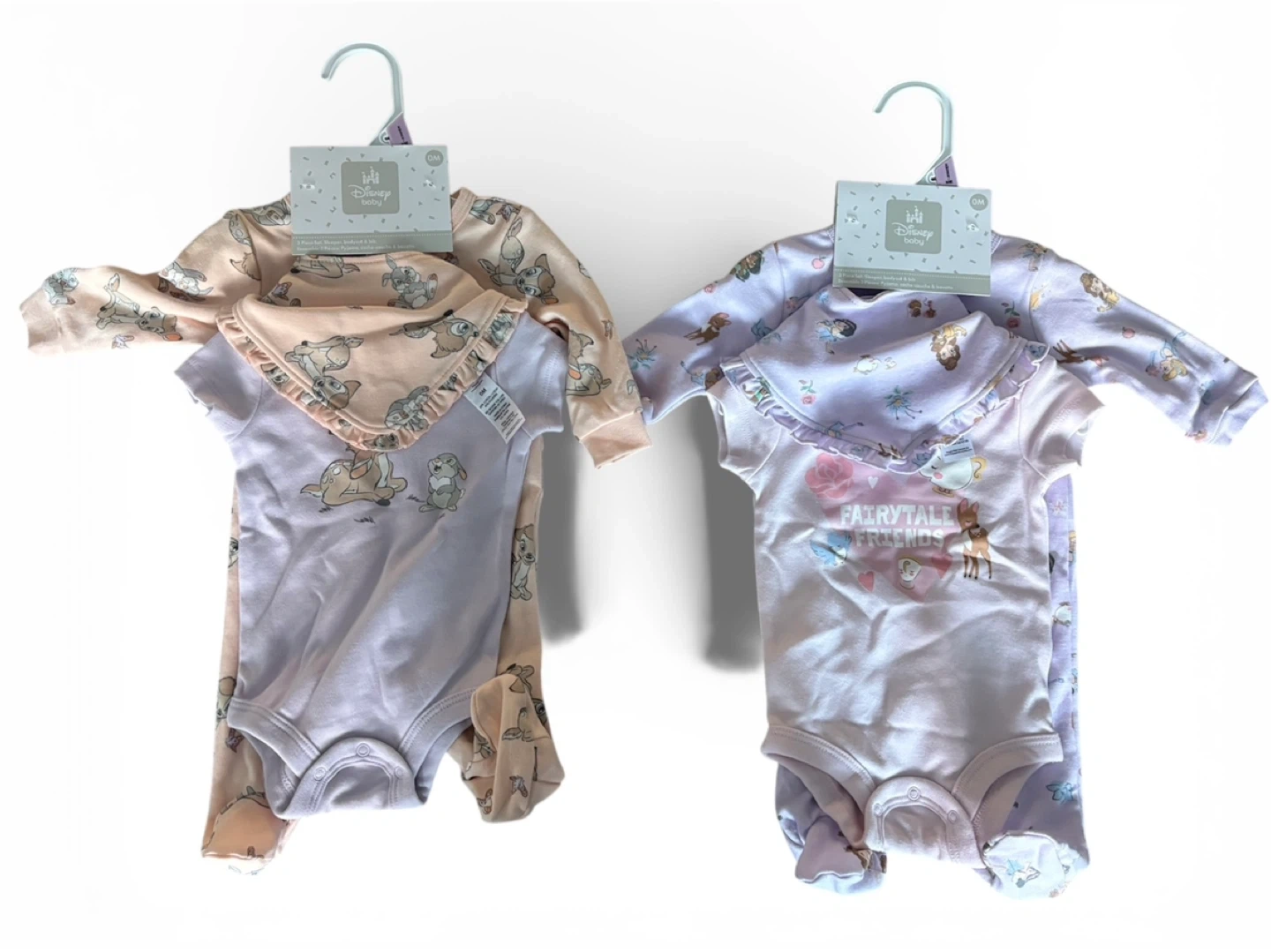 These Disney Baby sets each include two bodysuits and a bib. One outfit features Bambi characters, and the other outfit features fairytale characters. It's sized for newborns.