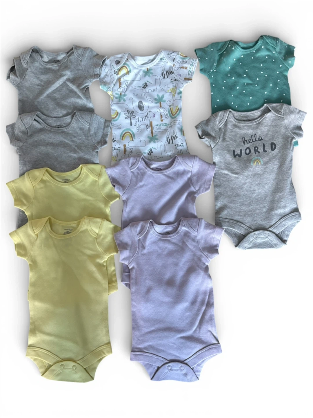 This pack includes 9 short-sleeved baby bodysuits from George. Features include solid colours, a green polka dot print, a grey "hello WORLD" print with a rainbow, and a playful jungle animal print. Made from soft cotton. Size 0 months/newborn.