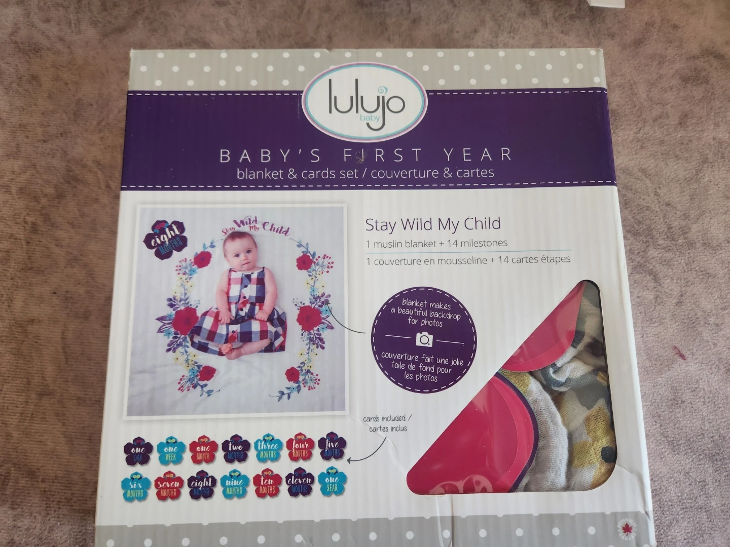 This Lulujo set includes one muslin blanket and 14 milestone cards. The blanket makes a beautiful backdrop for photos. It's perfect for tracking your baby's growth throughout their first year!