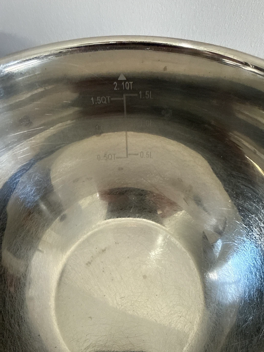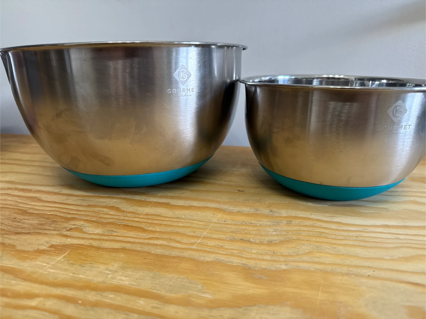 These two mixing bowls are from Gourmet Kitchen and feature non-slip silicone bases. Measurements are marked inside the bowls in quarts and litres. The larger bowl holds up to 5 quarts and the smaller one up to 2.1 quarts. They're made of durable stainless steel.
