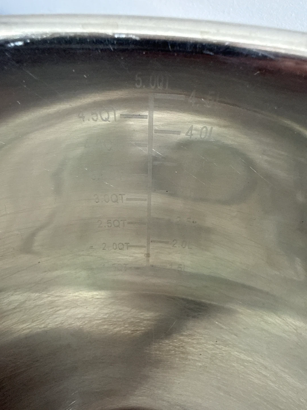 These two mixing bowls are from Gourmet Kitchen and feature non-slip silicone bases. Measurements are marked inside the bowls in quarts and litres. The larger bowl holds up to 5 quarts and the smaller one up to 2.1 quarts. They're made of durable stainless steel.