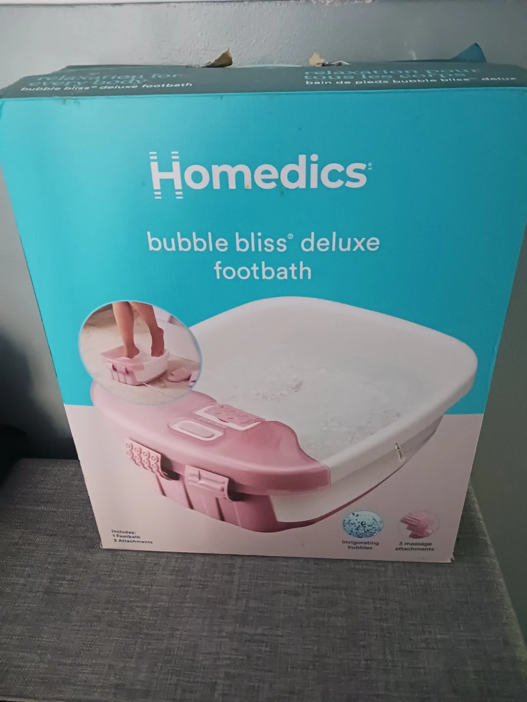This is the HoMedics Bubble Bliss Deluxe Footbath. It includes the footbath and 3 massage attachments. It provides invigor