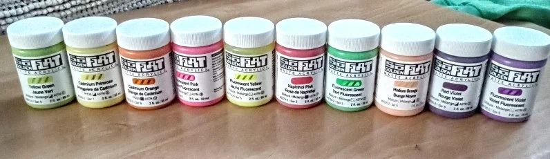 I am selling 10 Golden brand FLAT Matte Acrylic paints. Each bottle contains 2 fl. oz. (60 ml) of paint. Includes various colours like