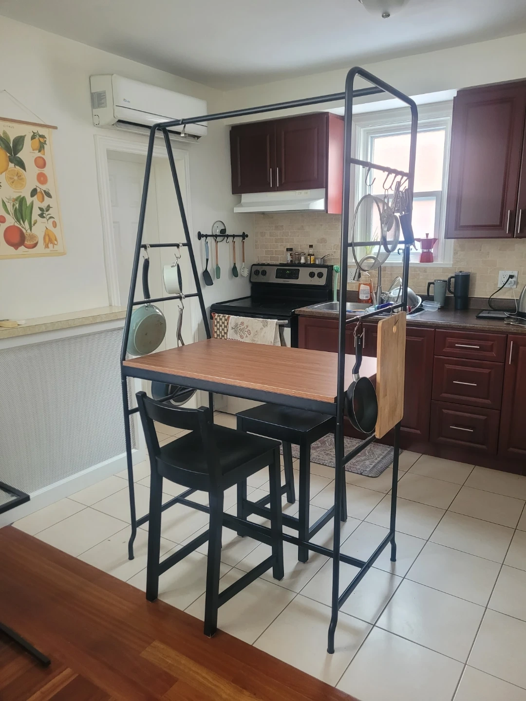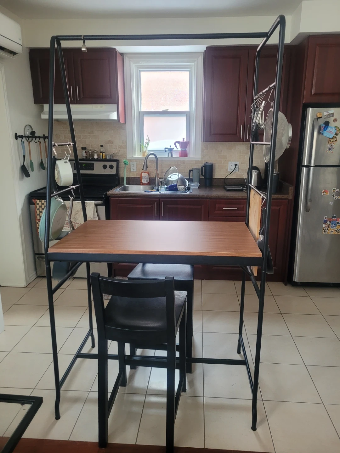 This kitchen island set includes a tabletop and two black stools. It's a great addition for smaller kitchens needing extra prep space. The frame is made of black metal, and the tabletop has a wood-grain finish.