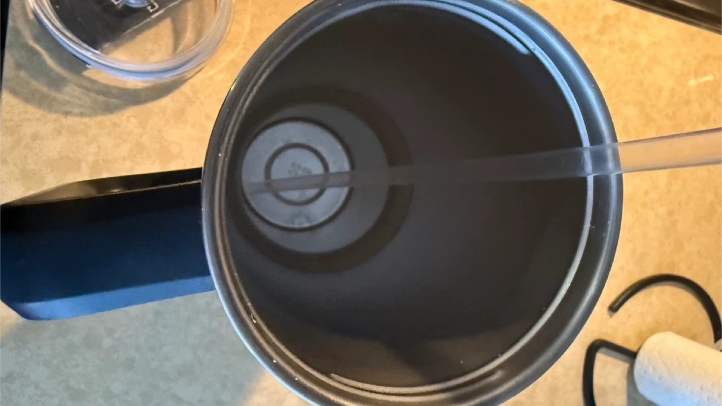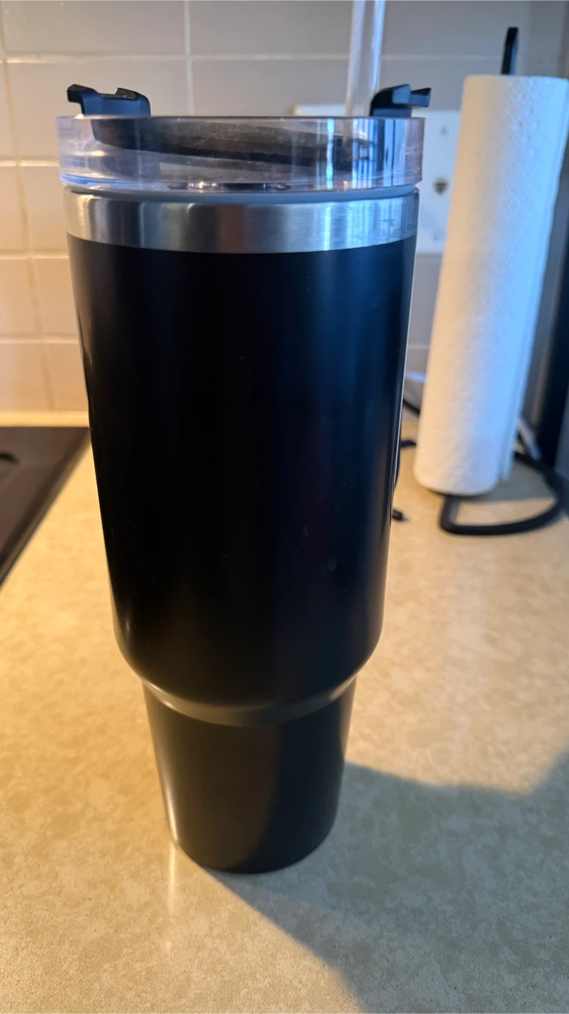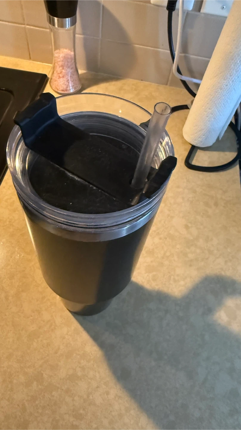 This black insulated tumbler keeps your drinks cold or hot. It's made of stainless steel with a secure lid and a reusable straw. The tumbler's construction helps maintain beverage temperature for extended periods. It's useful for everyday hydration at home or on the go!