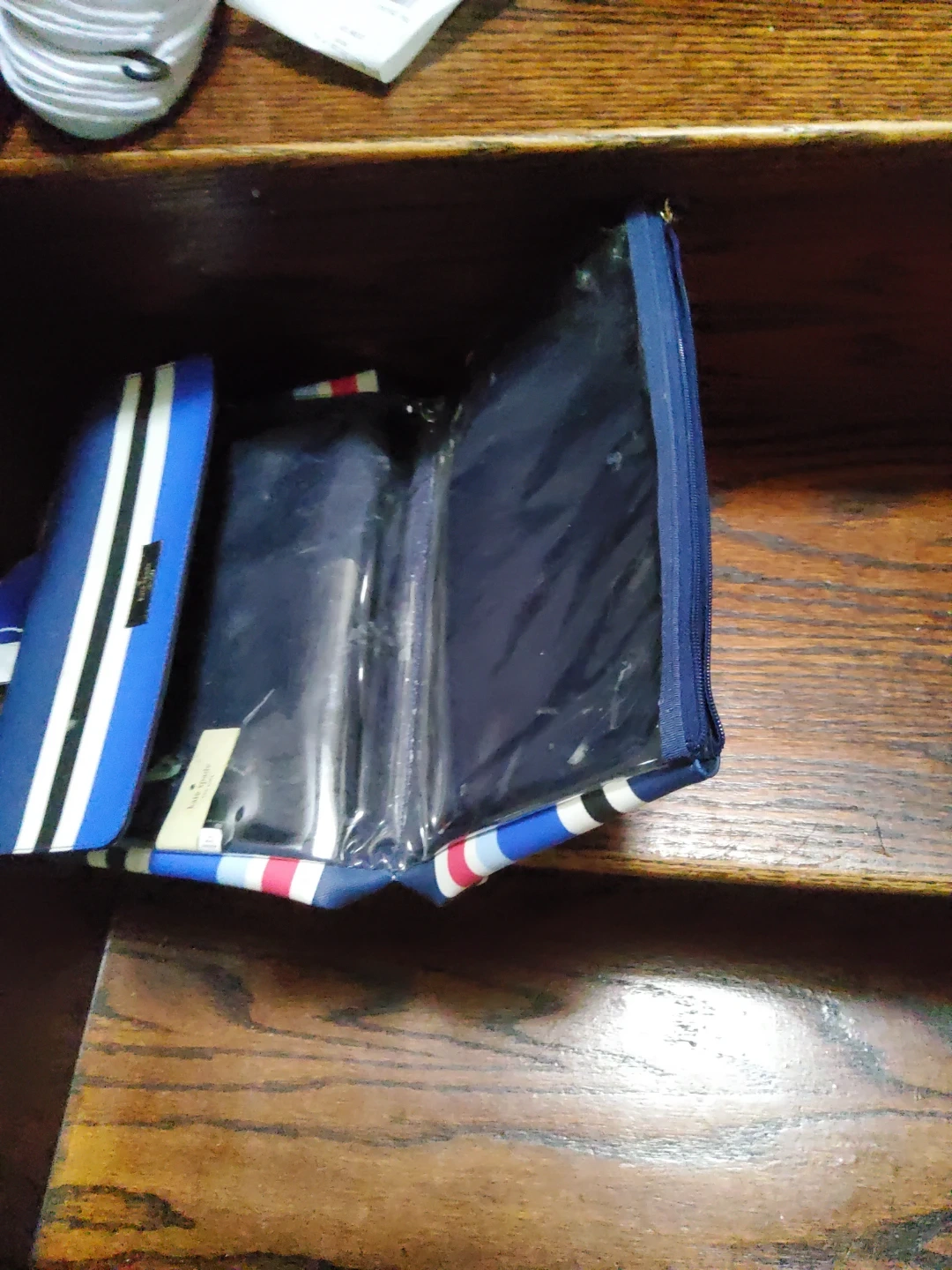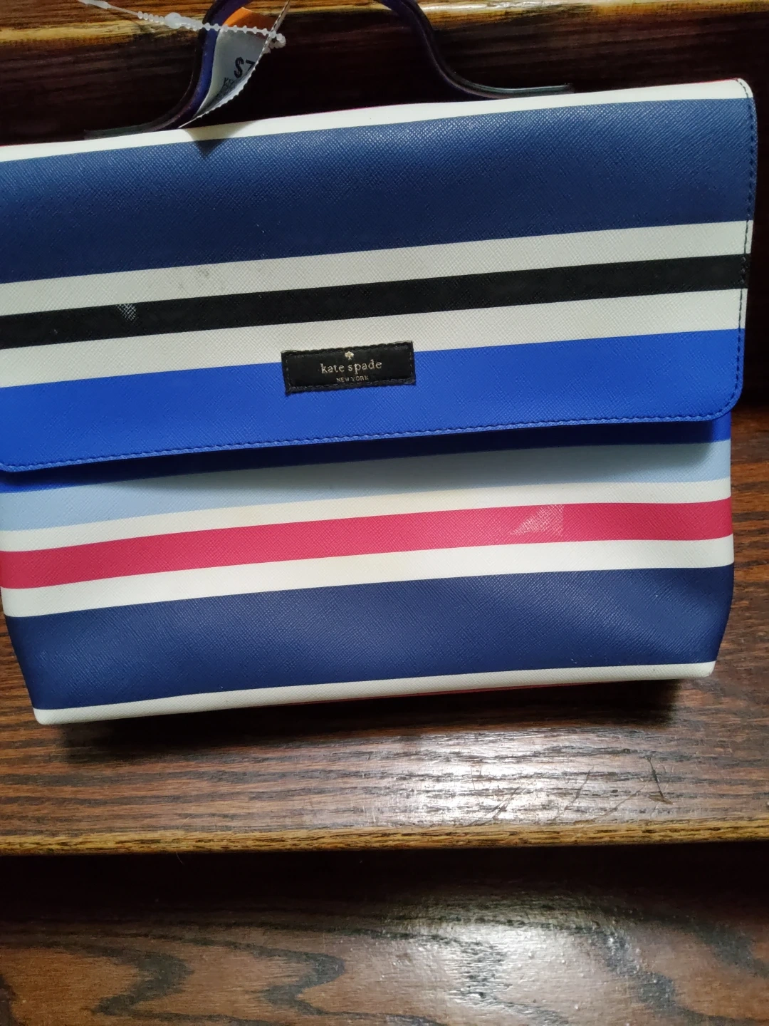 Kate Spade cosmetic bag with a blue, white, black, pink, and red stripe pattern. It's a travel organizer with clear compartments inside. The exterior is durable and easy to wipe clean.