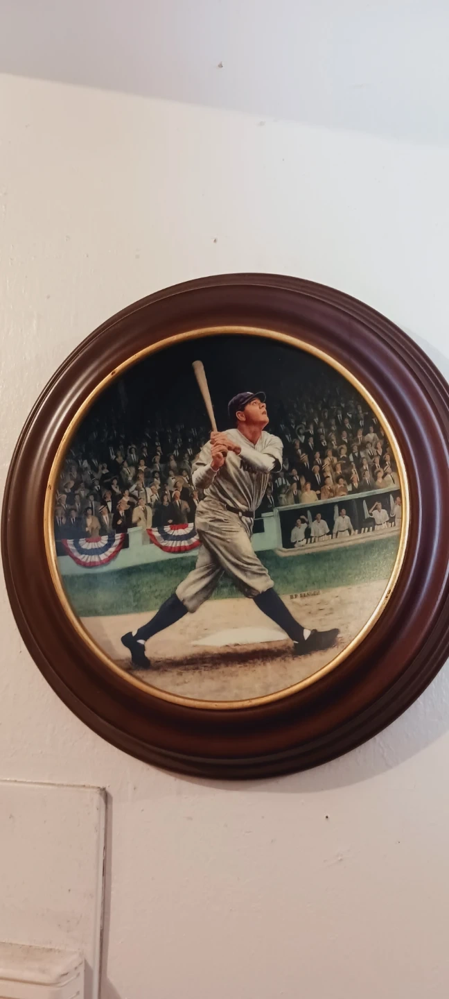 This is the first issue in the "The Legends of Baseball" collection, titled "Babe Ruth: The Called Shot". It's crafted in fine porcelain with 22-karat gold trim. This plate is part of a limited edition of 150 firing days. Created by acclaimed sports artist Brent Benger. Excellent condition. It is framed and ready to hang. 11" diameter. ALL MY PRICES ARE NEGOTIABLE !!