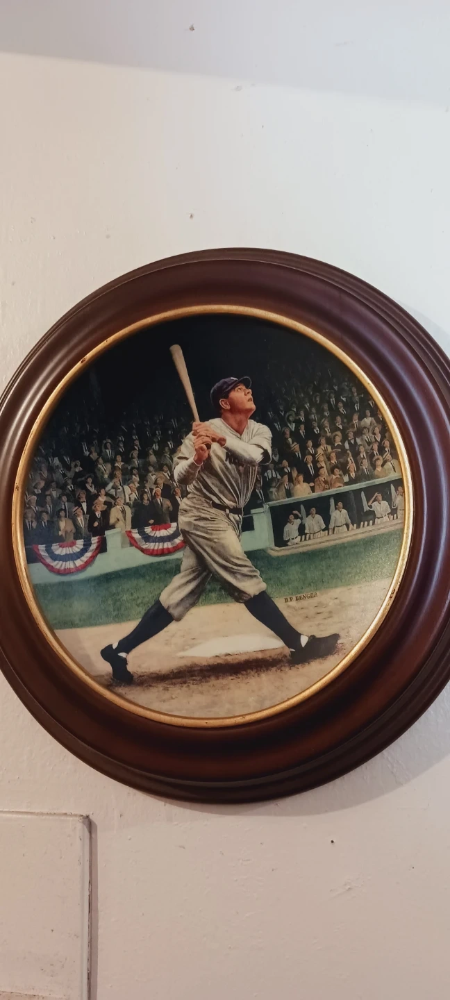 This is the first issue in the "The Legends of Baseball" collection, titled "Babe Ruth: The Called Shot". It's crafted in fine porcelain with 22-karat gold trim. This plate is part of a limited edition of 150 firing days. Created by acclaimed sports artist Brent Benger. Excellent condition. It is framed and ready to hang. 11" diameter. ALL MY PRICES ARE NEGOTIABLE !!