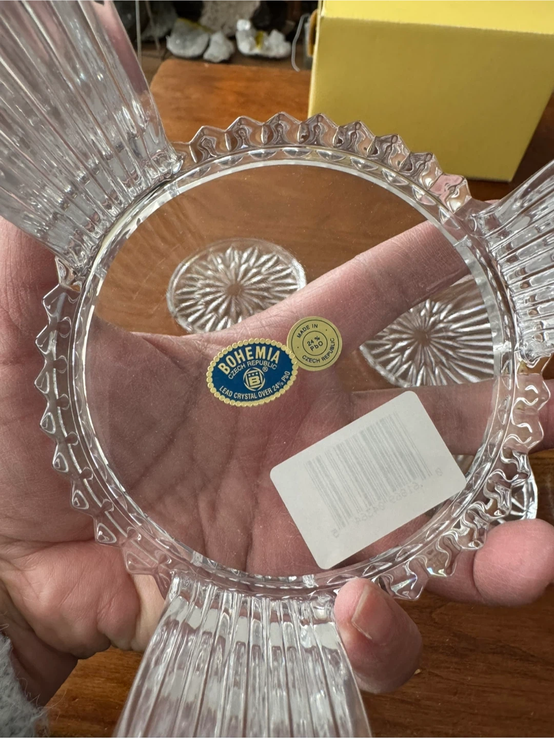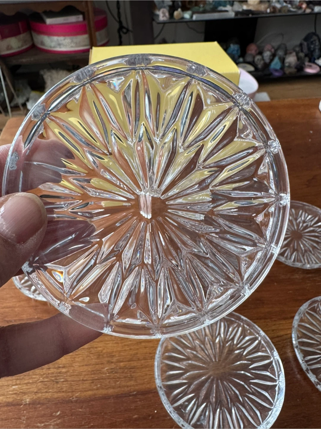 Set of six beautiful lead crystal coasters from Bohemia. This set includes a decorative holder for the coasters. It's perfect for protecting your furniture from drink rings.