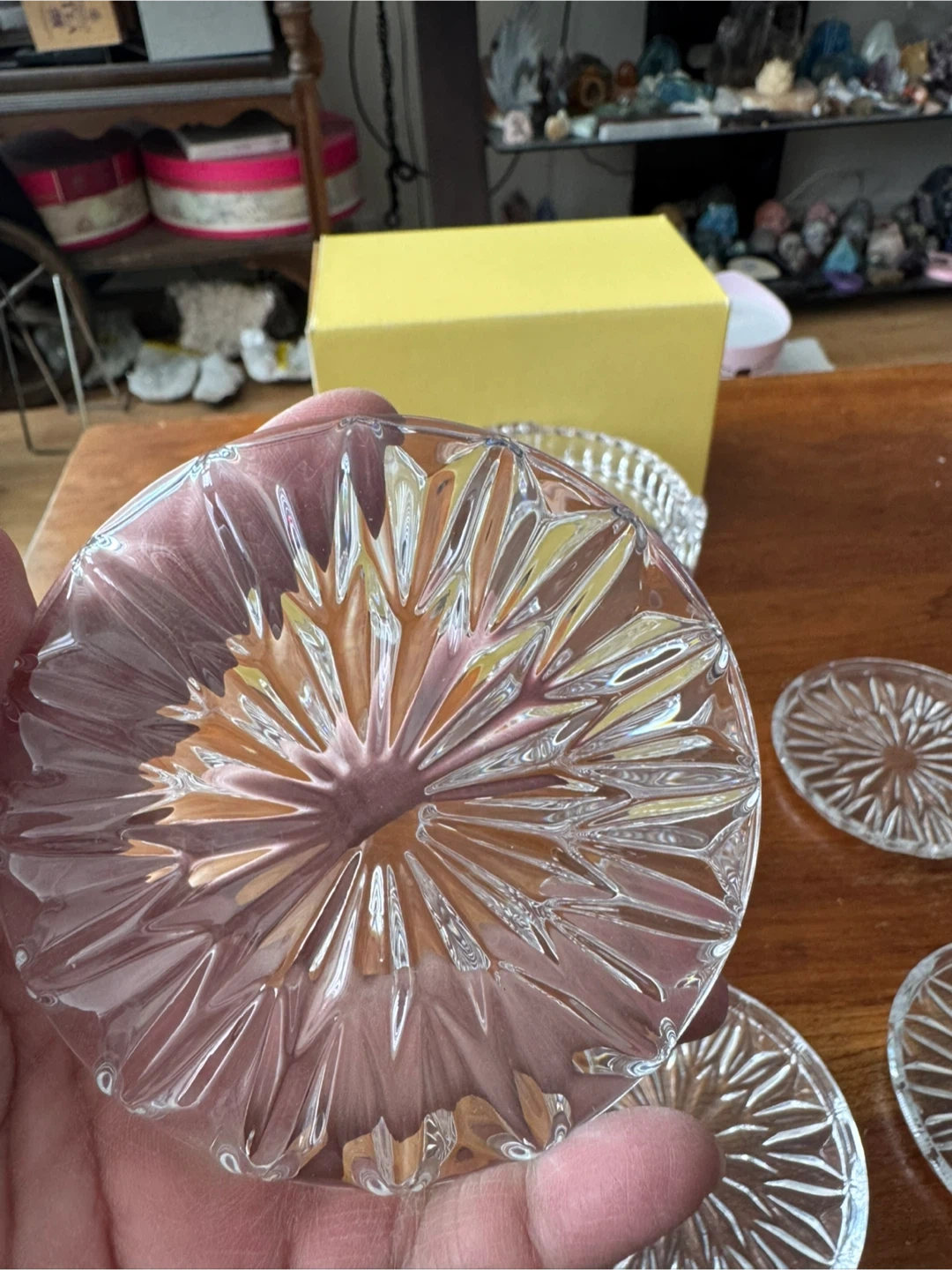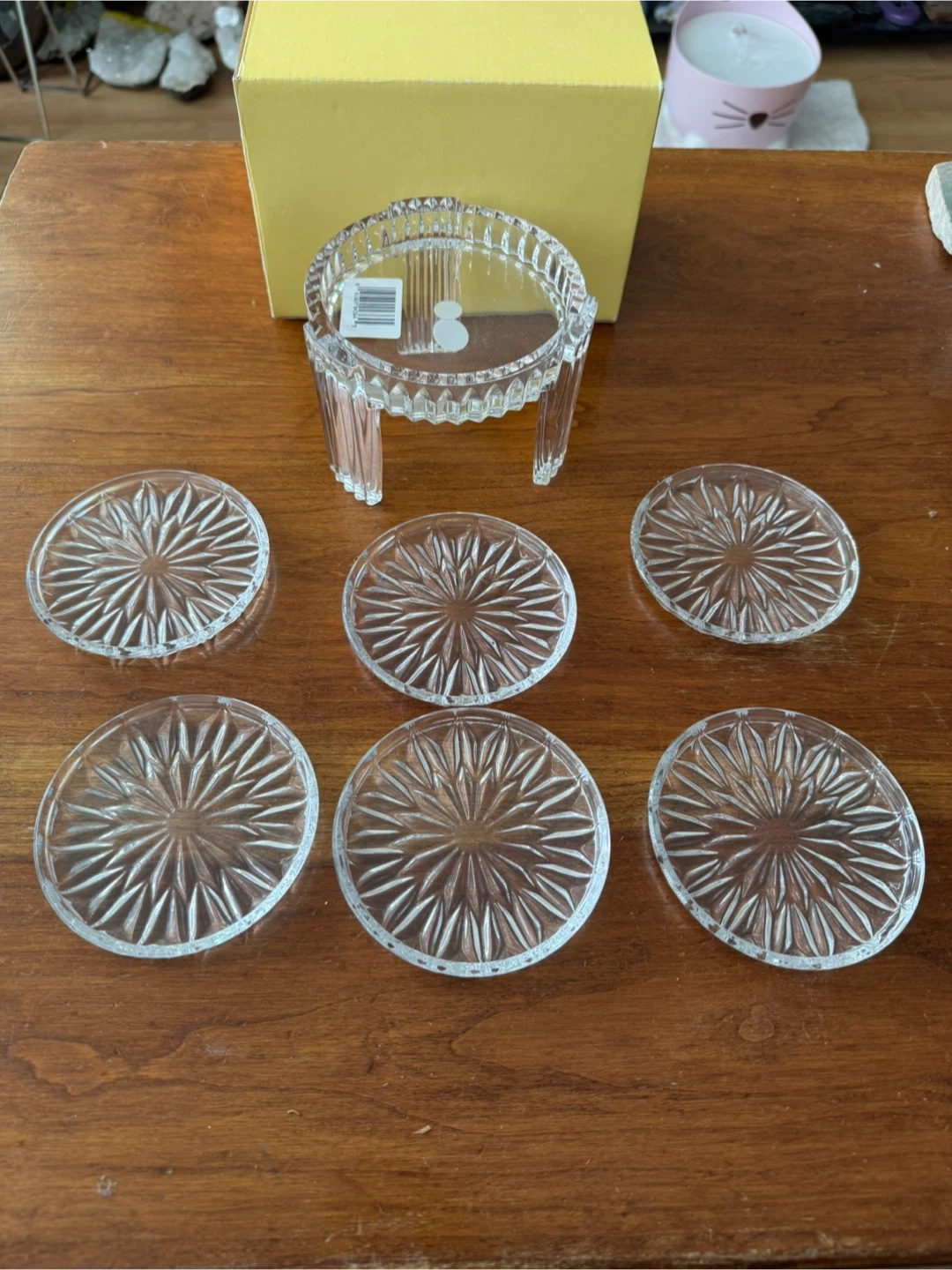 Set of six beautiful lead crystal coasters from Bohemia. This set includes a decorative holder for the coasters. It's perfect for protecting your furniture from drink rings.