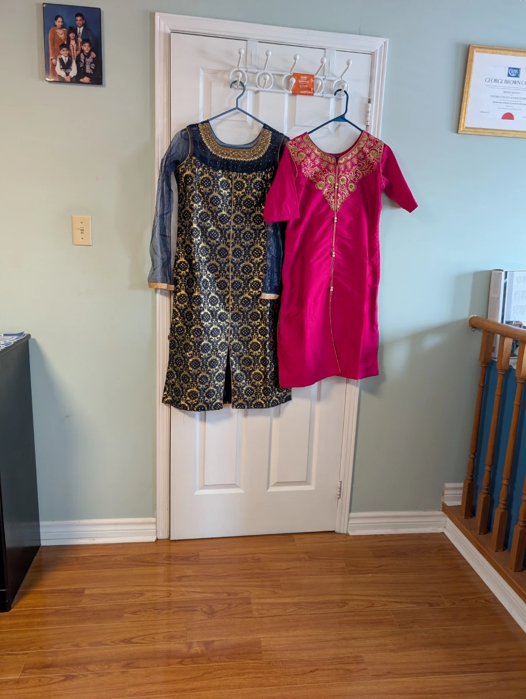 Two women's kurtis, one navy blue with gold embroidery and sheer sleeves, and one bright pink with ornate gold neckline embroidery. Both are elegant and suitable for festive occasions.