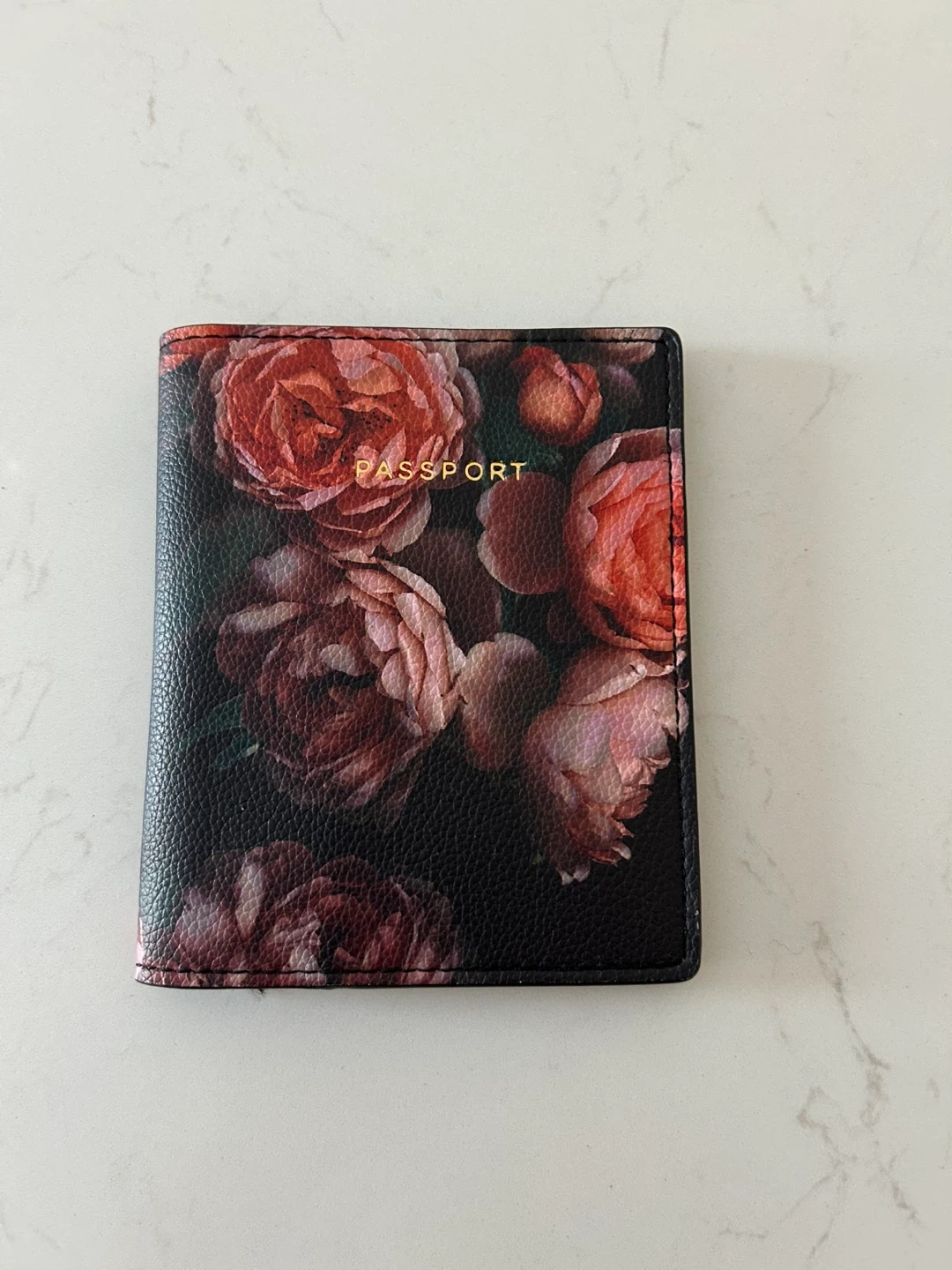 This passport holder features a beautiful floral print on a black background. It's made of faux leather and has slots for your passport and cards. Perfect for keeping your travel documents organized!